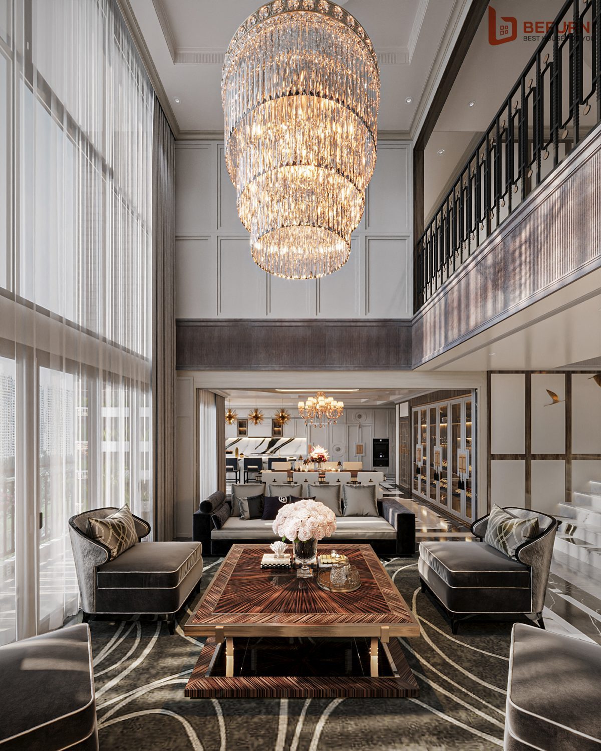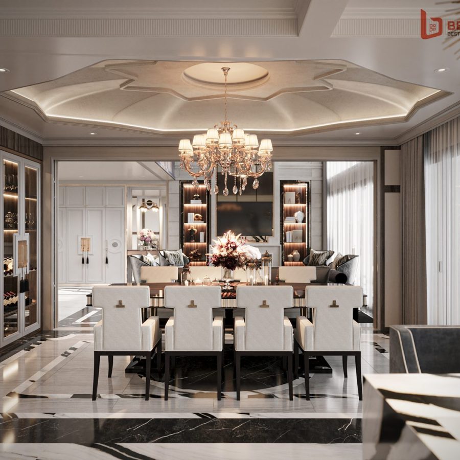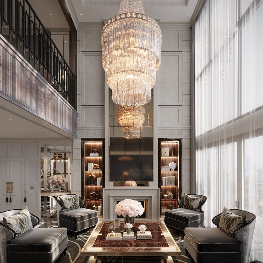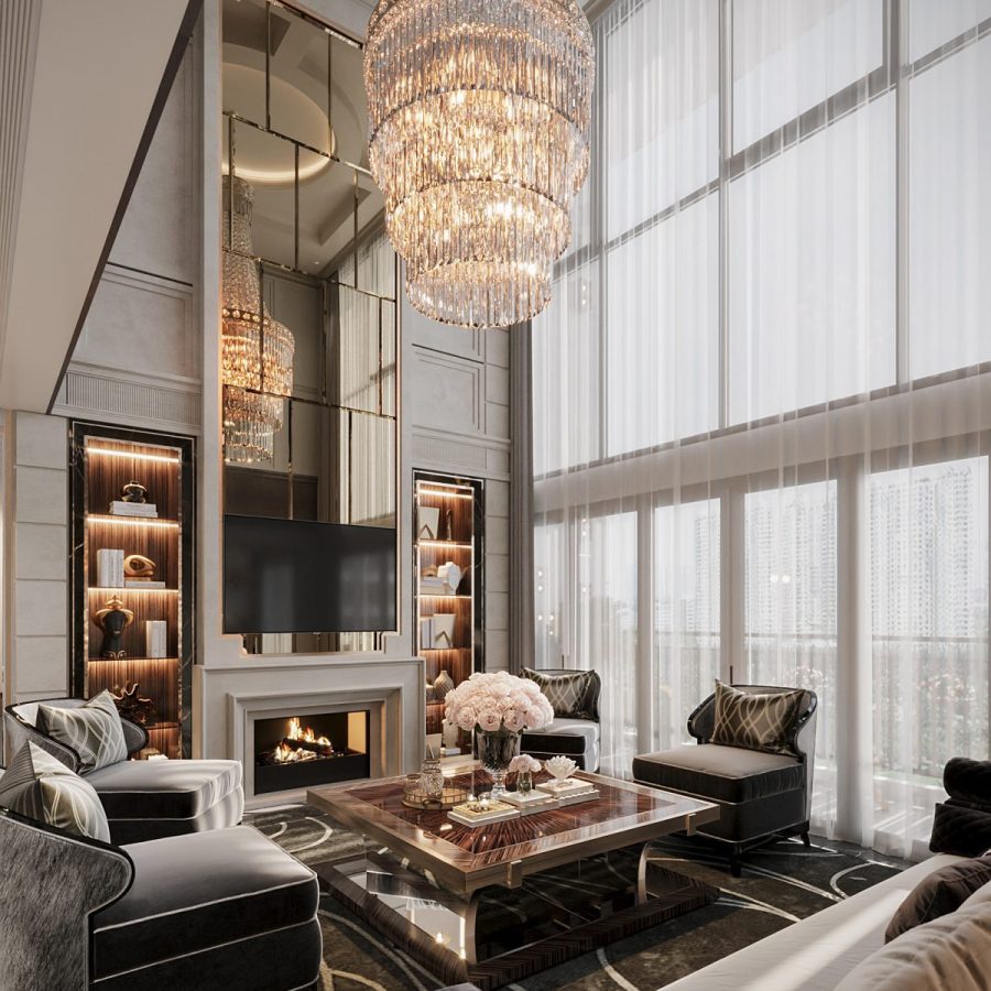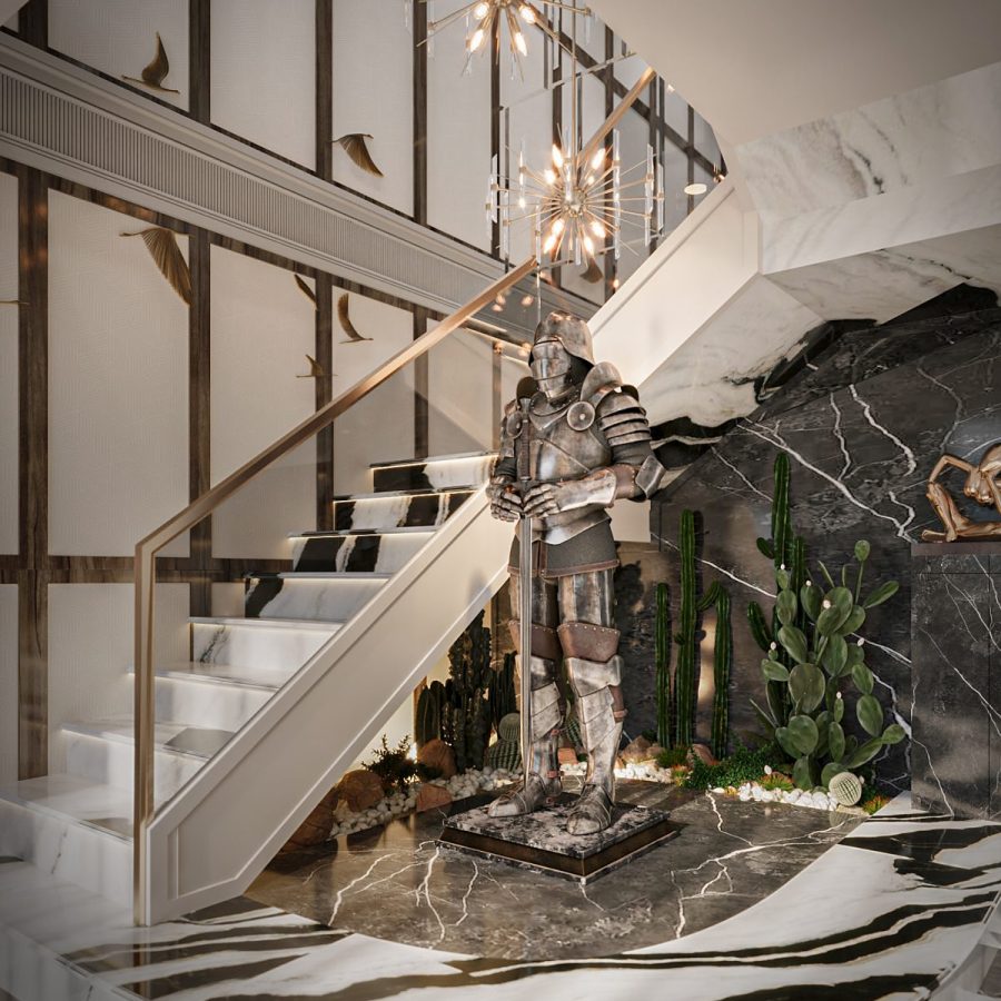 Luxury Modern Living Room with Marble Coffee Table and Black Sofa Set – 3D Model_IDC1118107877
