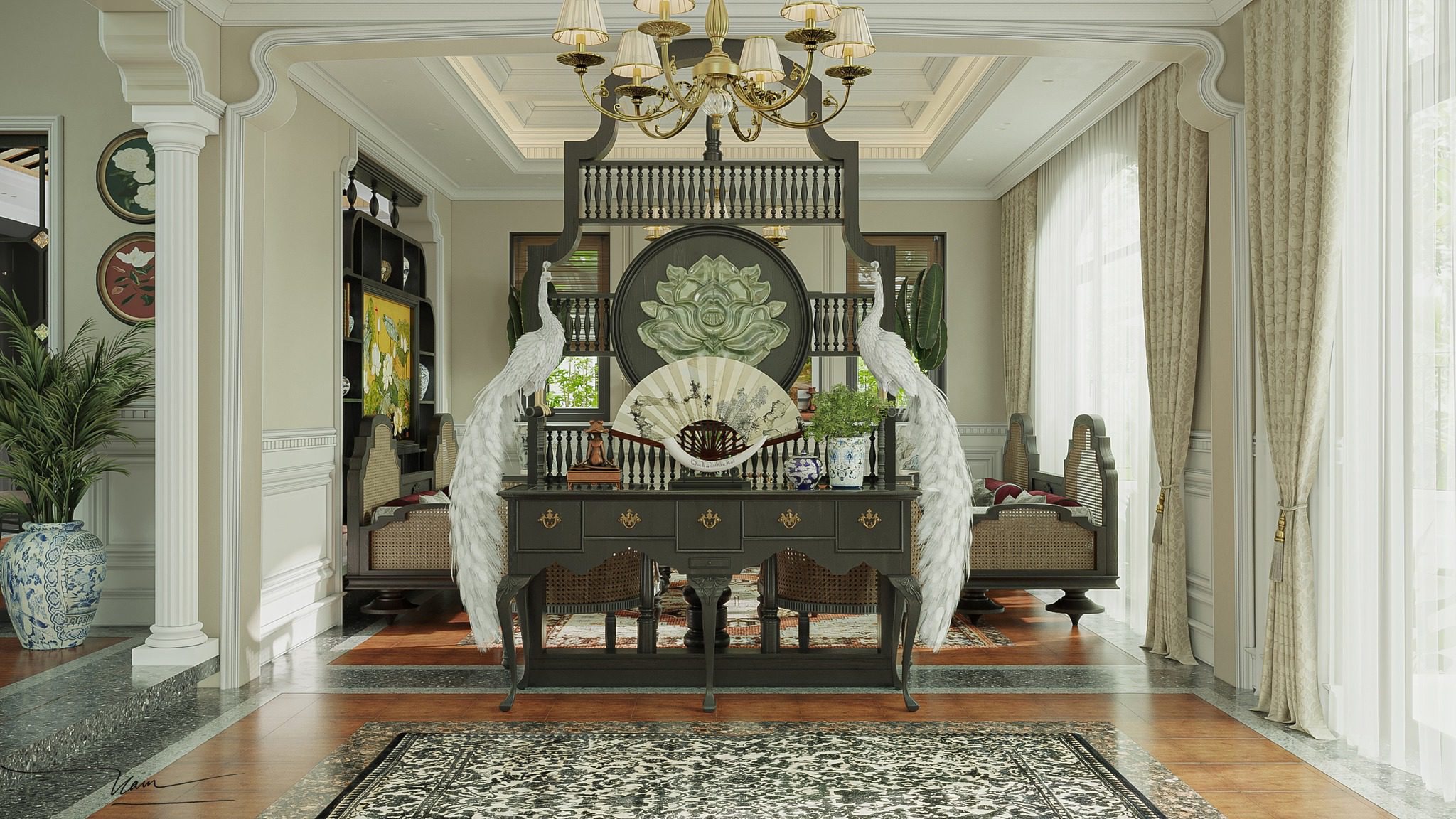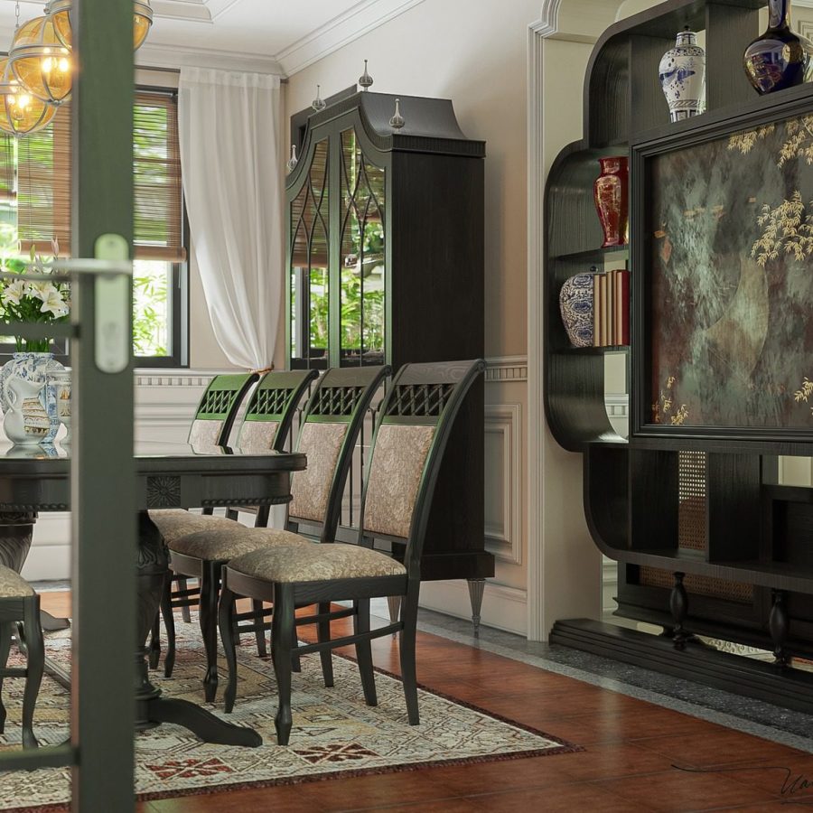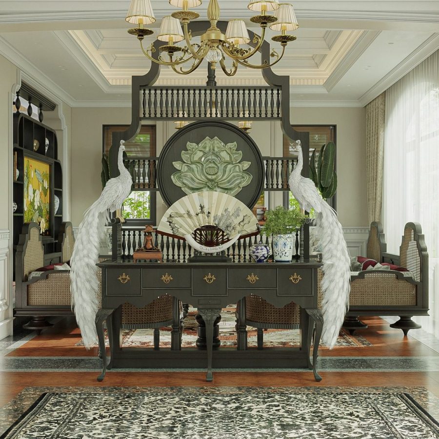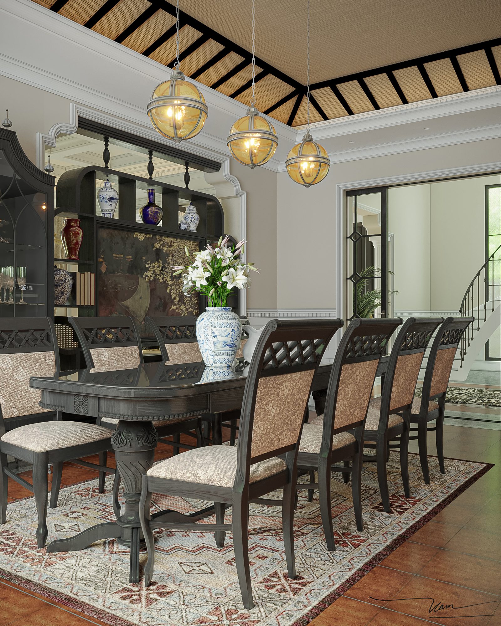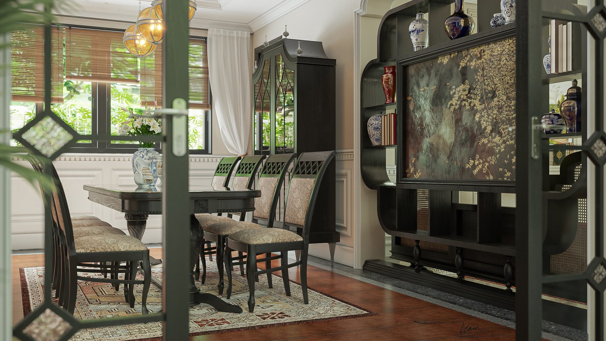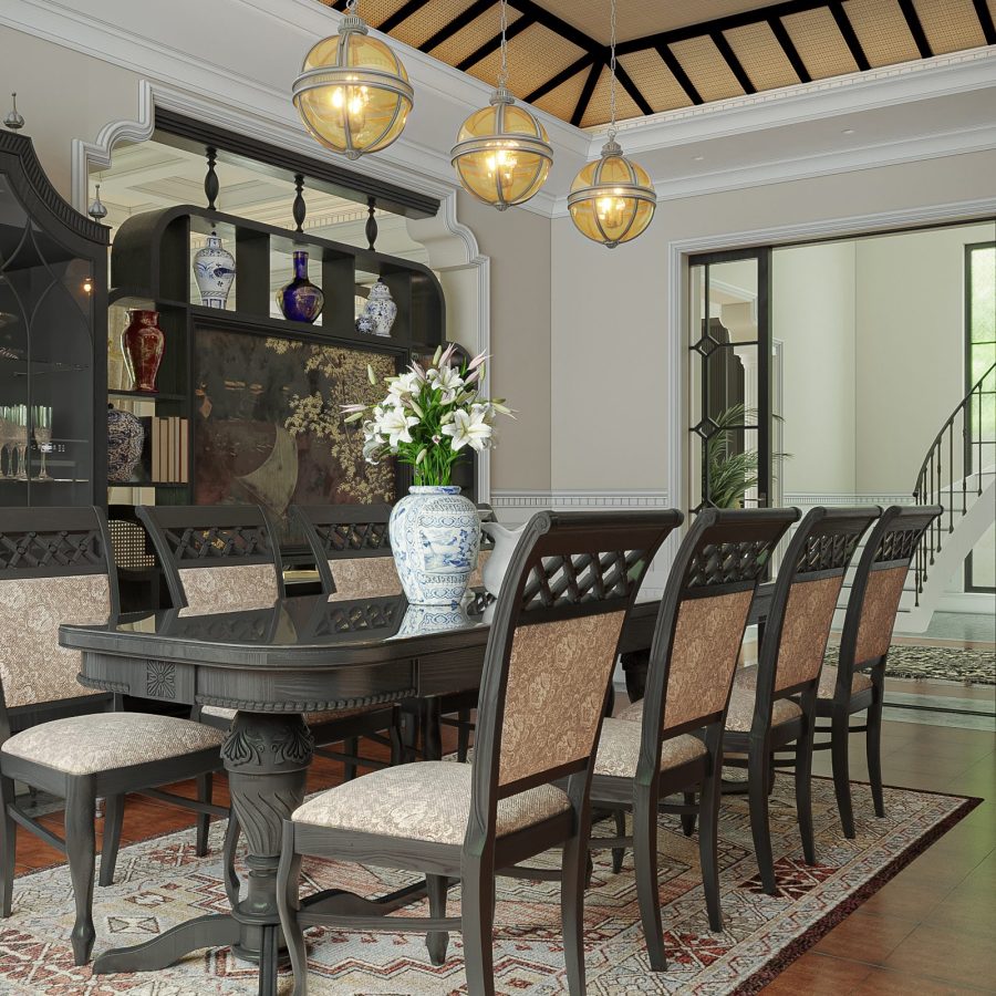 Asian Style Luxury Dining Room with Round Table and Wall Art – 3D Model_HCI4803719917259