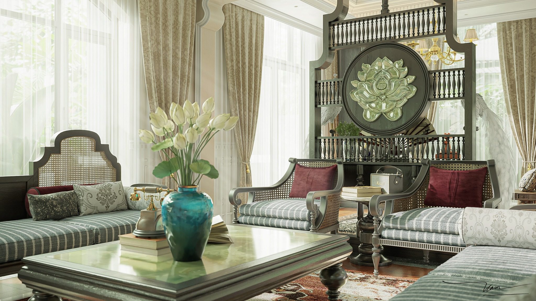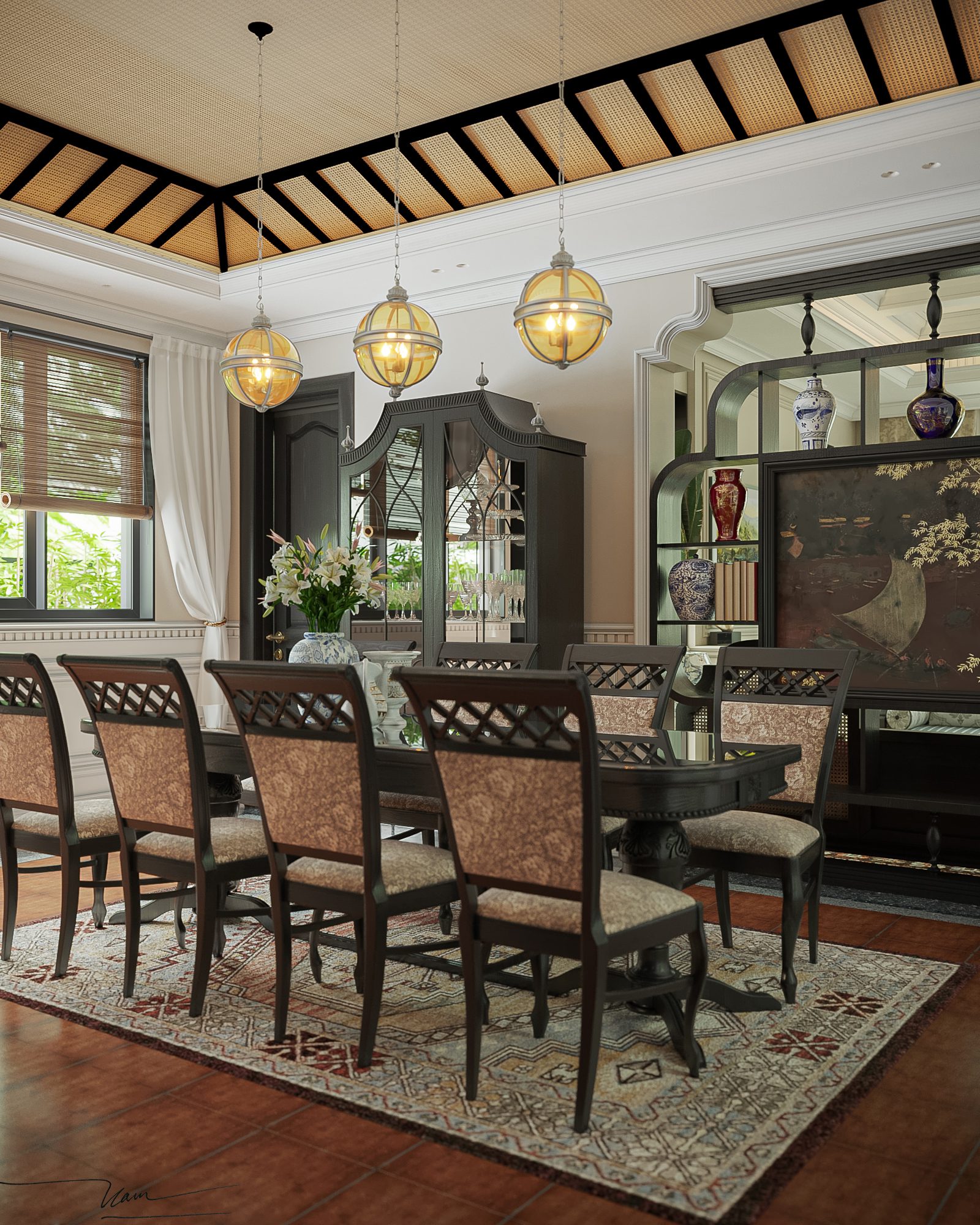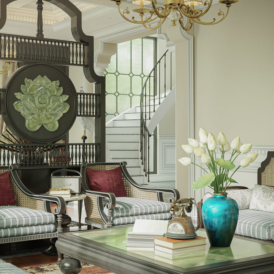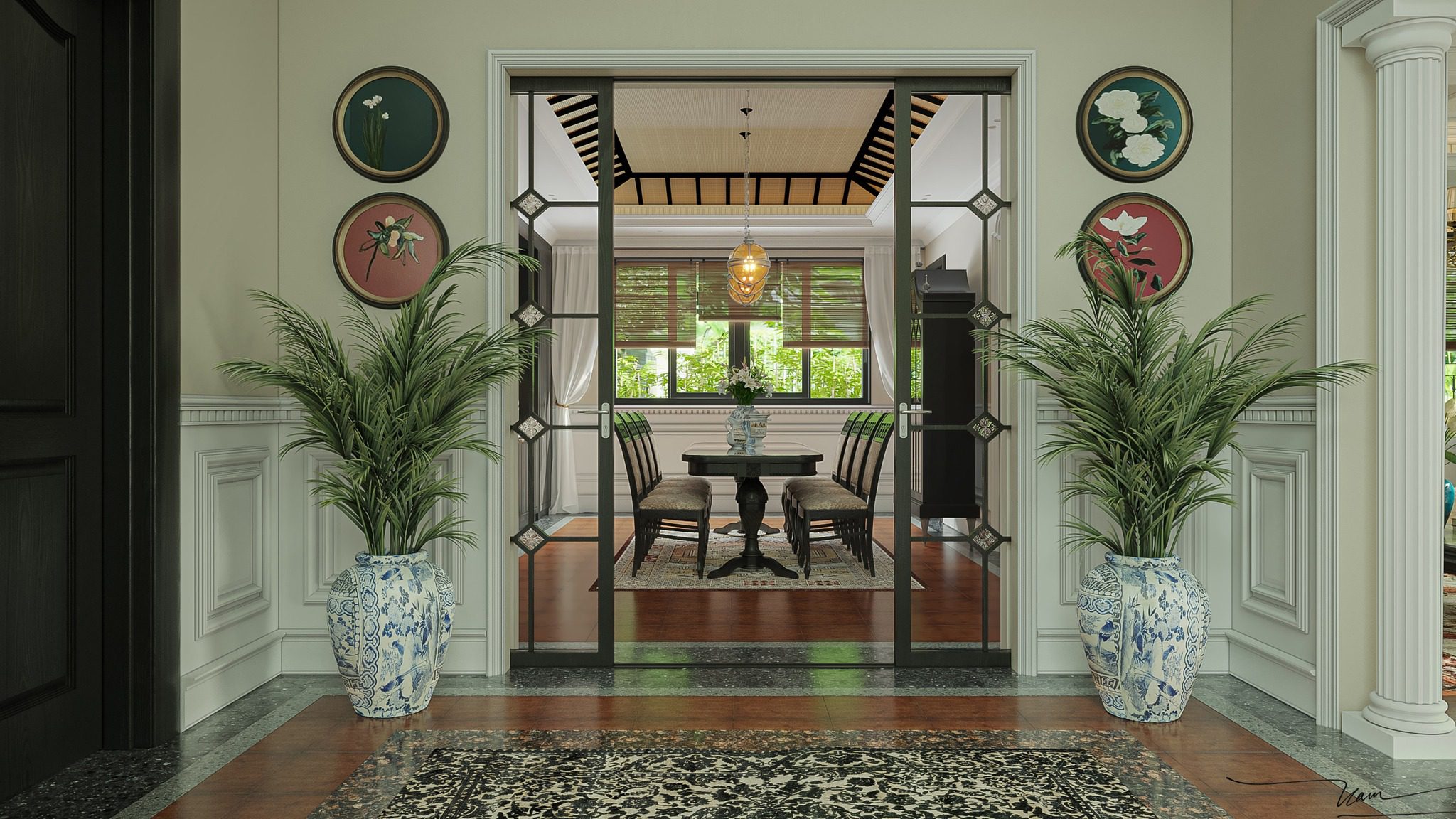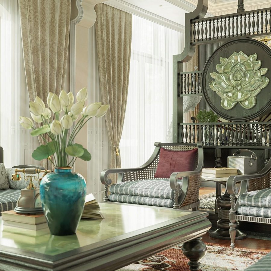 Asian Style Luxury Dining Room with Round Table and Wall Art – 3D Model_HCI4803719917259