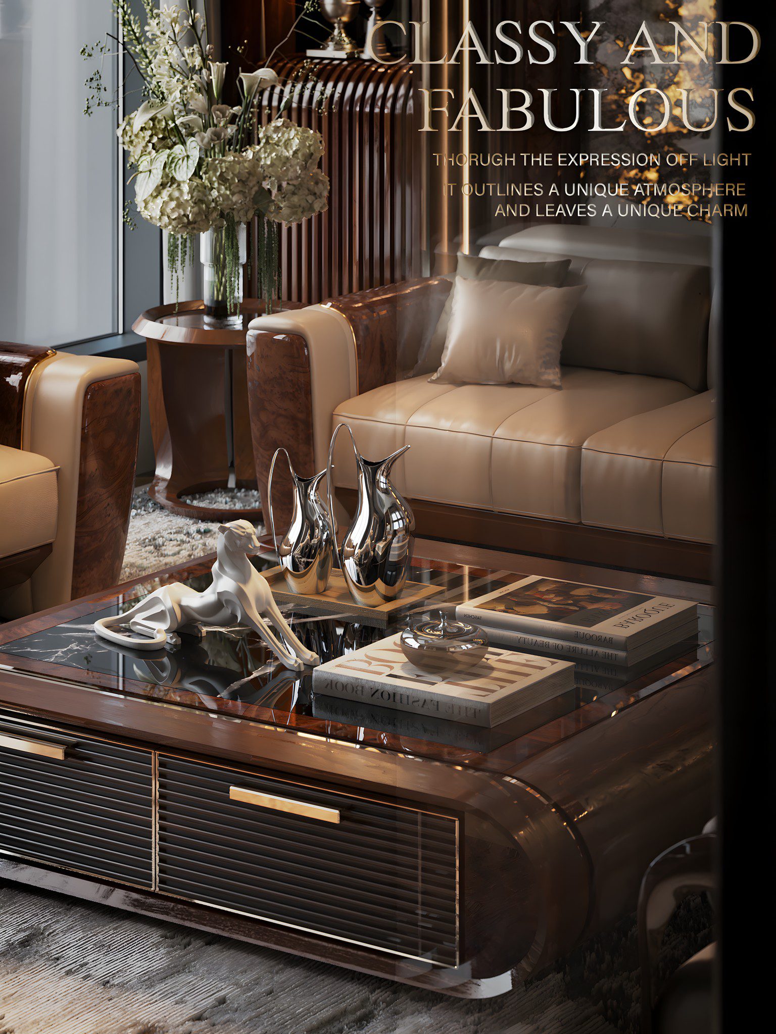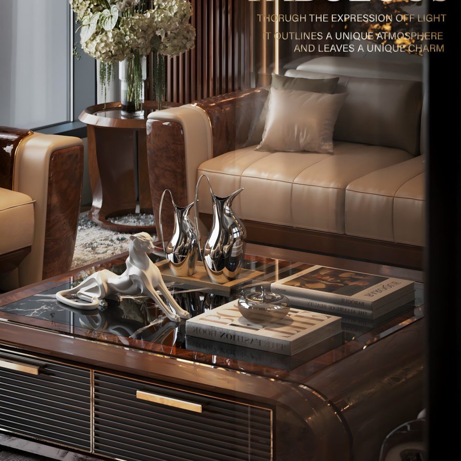 Luxury Modern Living Room with Marble Coffee Table and Black Sofa Set – 3D Model_IDC1118107877