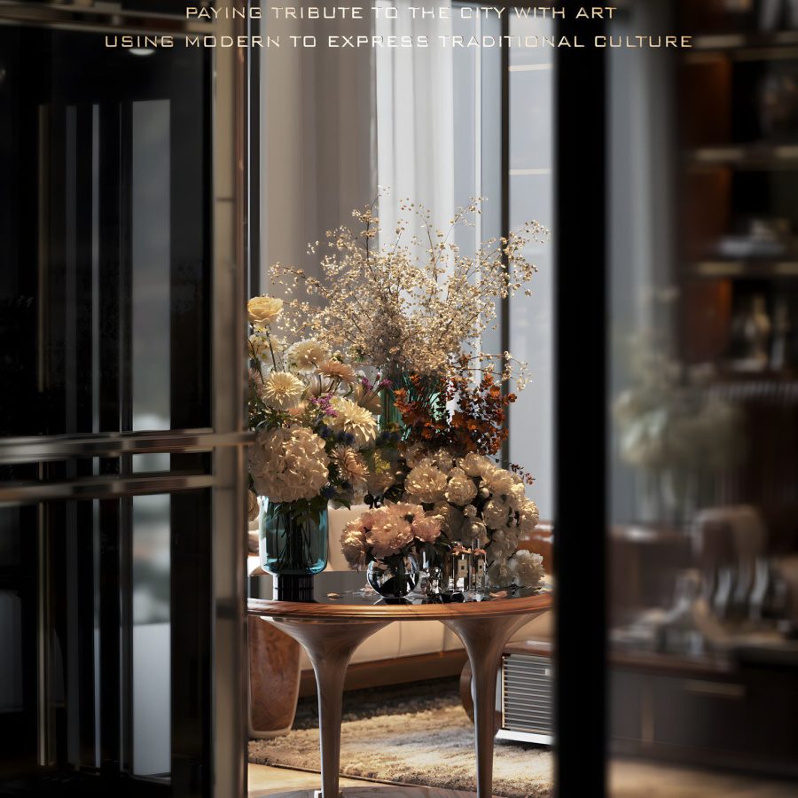 Asian Style Luxury Dining Room with Round Table and Wall Art – 3D Model_HCI4803719917259