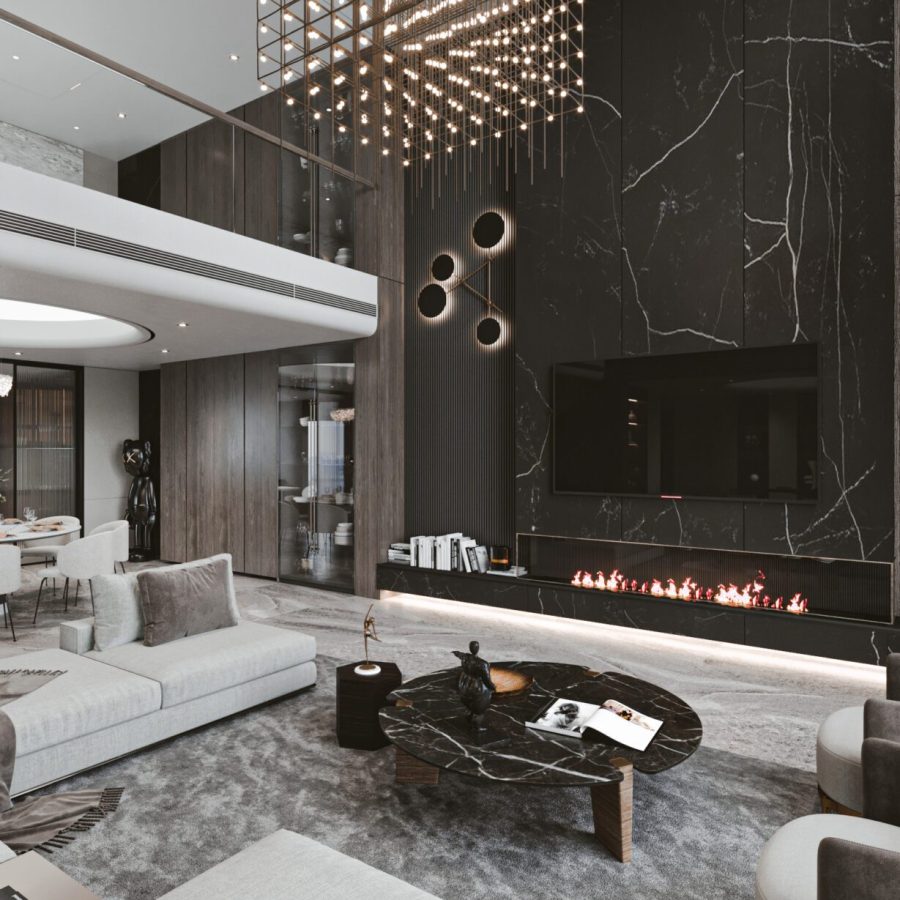 Luxury Modern Living Room with Marble Coffee Table and Black Sofa Set – 3D Model_IDC1118107877