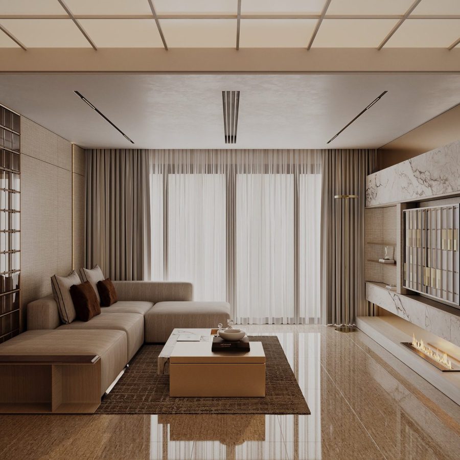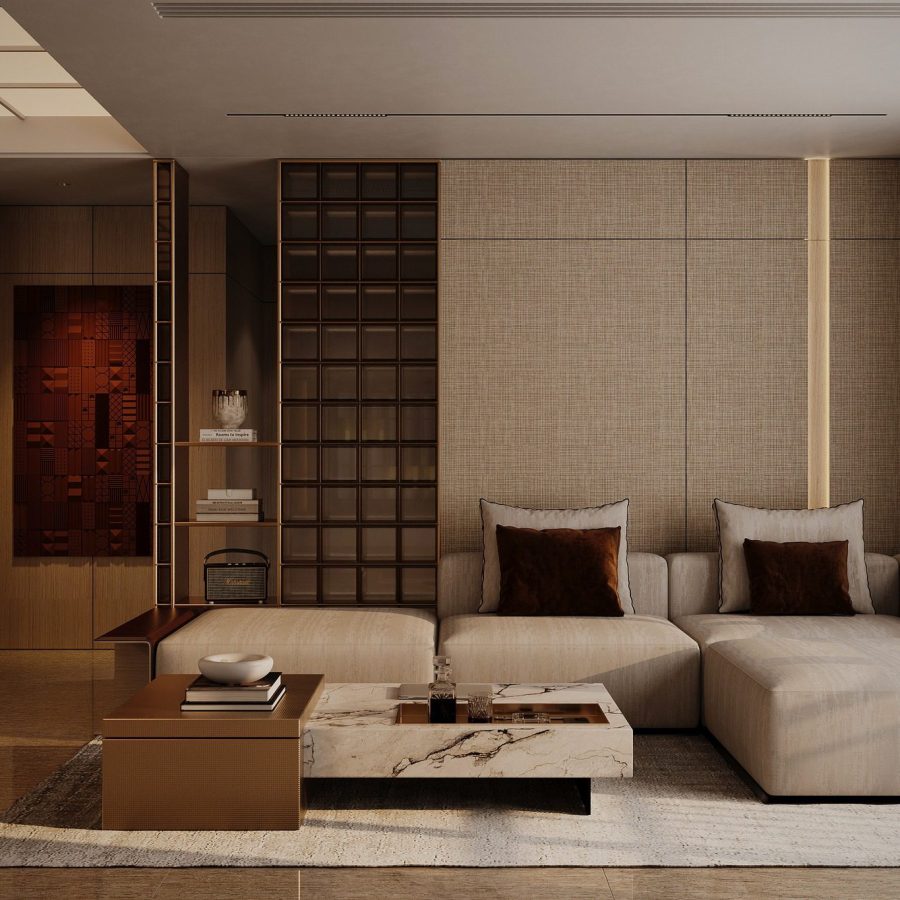 Luxury Modern Living Room with Marble Coffee Table and Black Sofa Set – 3D Model_IDC1118107877