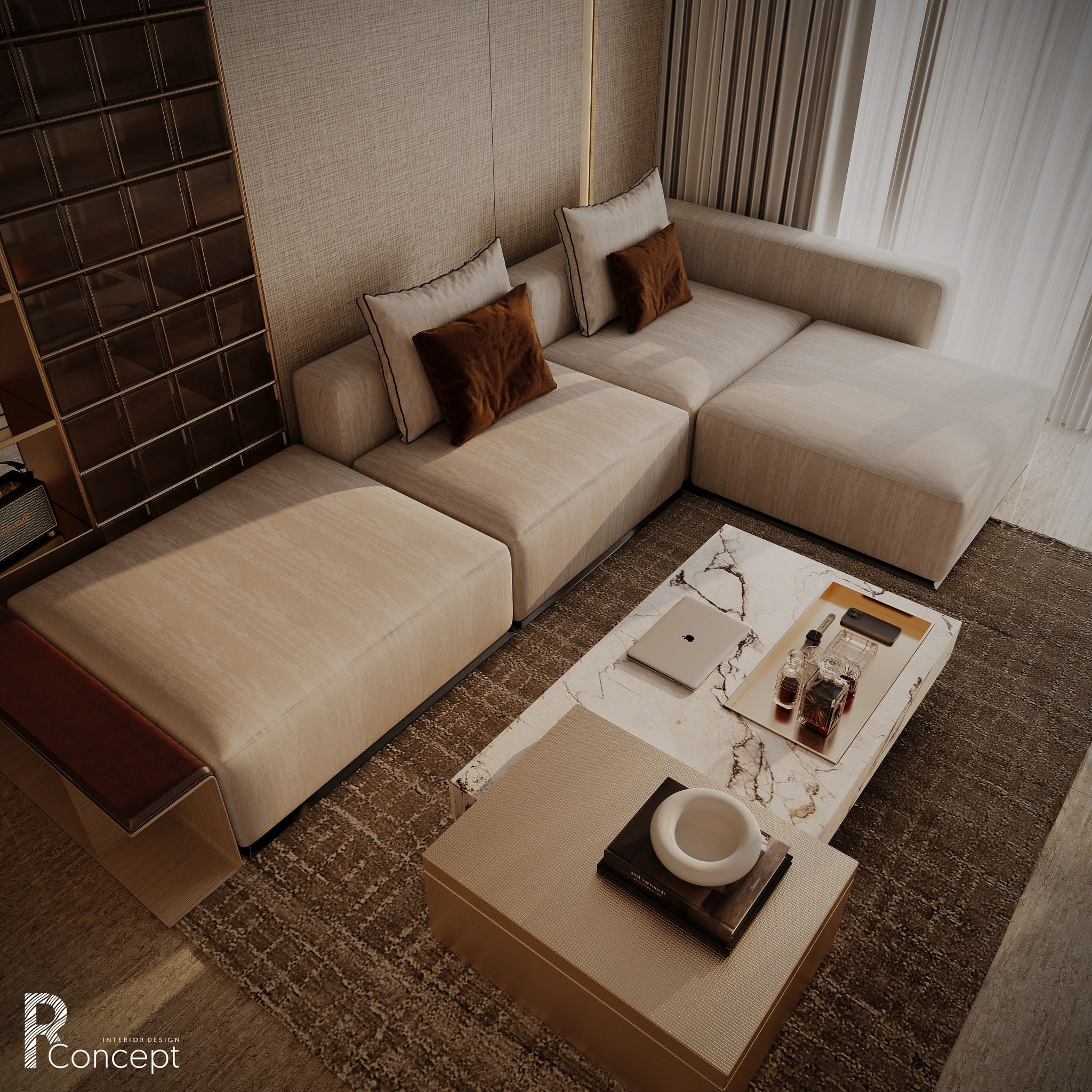 Luxury Modern Living Room with Marble Coffee Table and Black Sofa Set – 3D Model_114971306