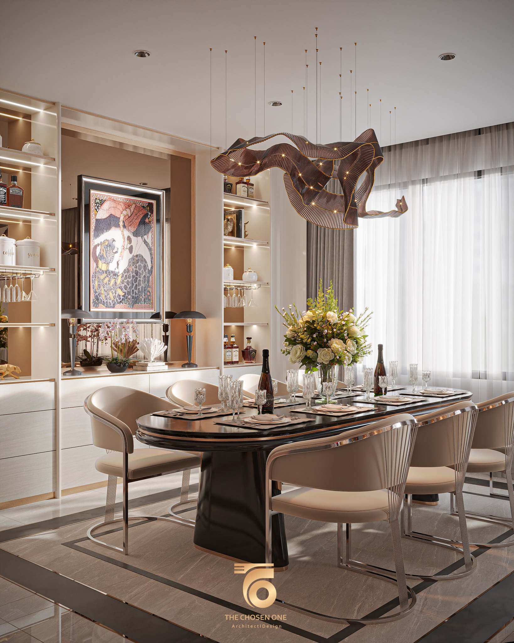 Asian Style Luxury Dining Room with Round Table and Wall Art – 3D Model_HCI4803719917259