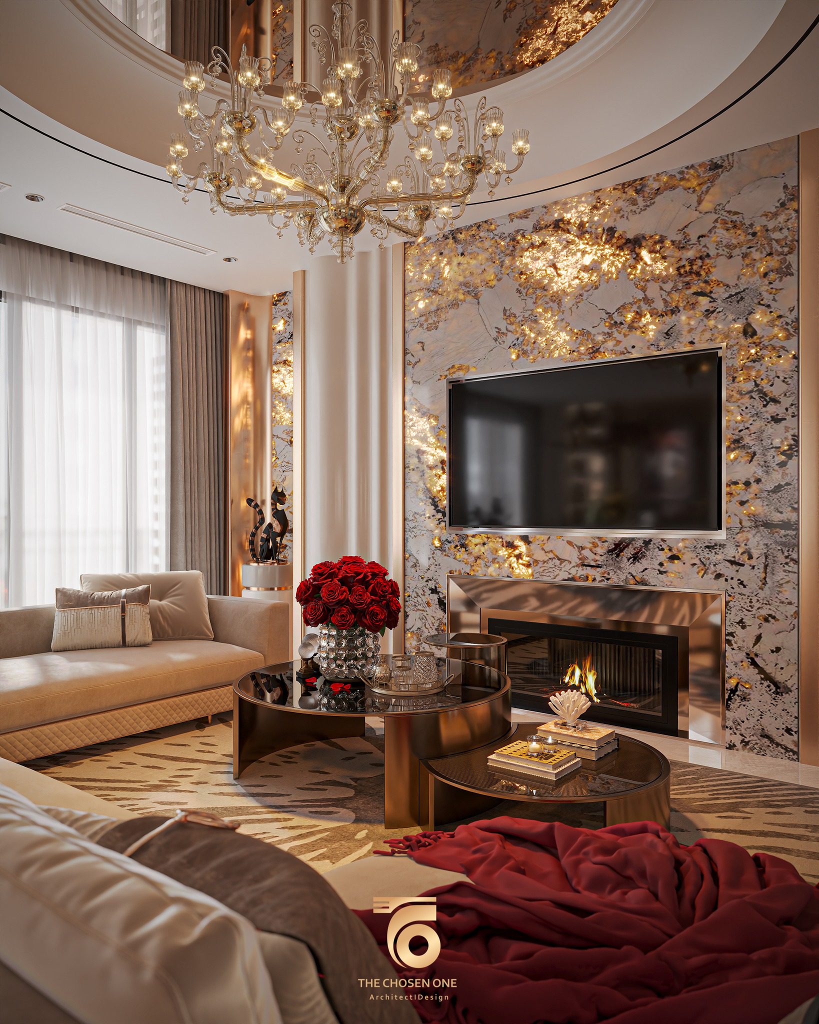 Luxury Modern Living Room with Marble Coffee Table and Black Sofa Set – 3D Model_IDC1117421308