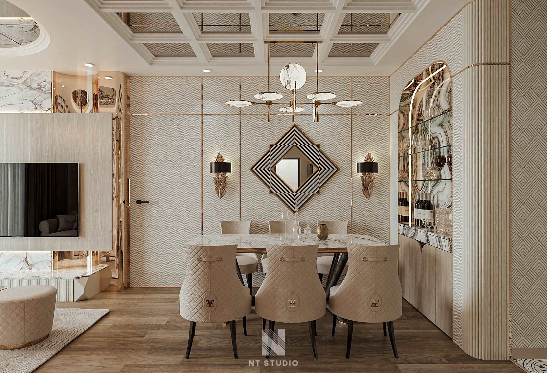 Asian Style Luxury Dining Room with Round Table and Wall Art – 3D Model_HCI4803719917259