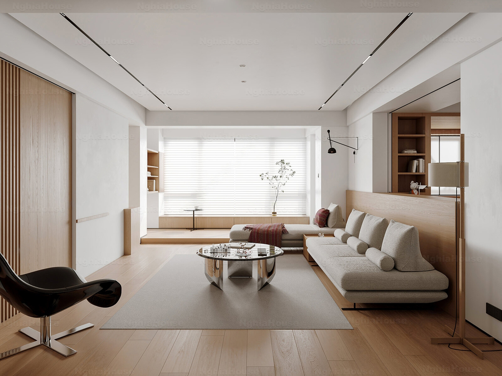 Minimalist White Living Room with Curved Sofa and Modern Desk – 3D Model_1156372390