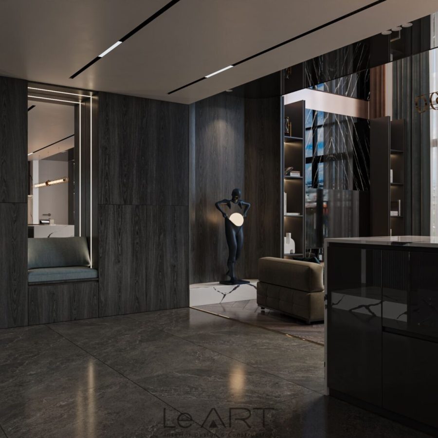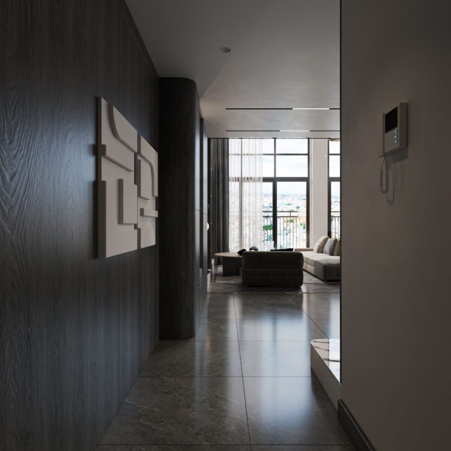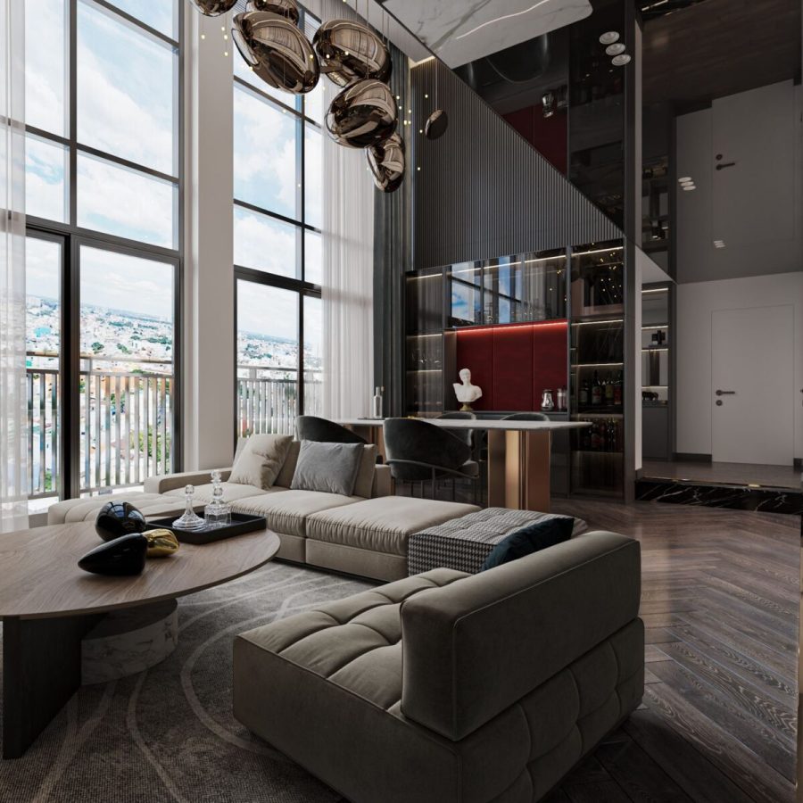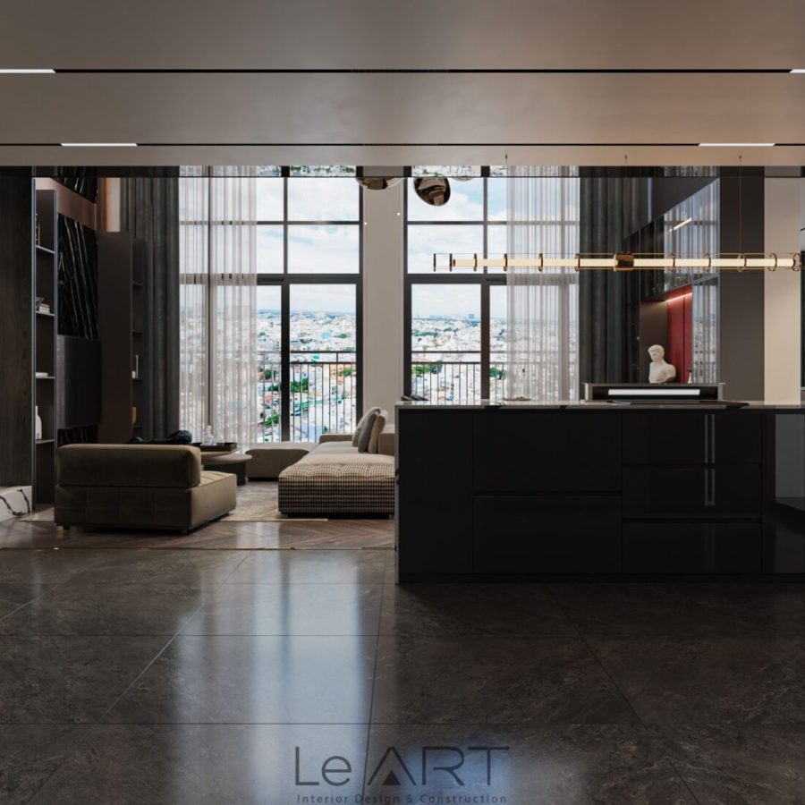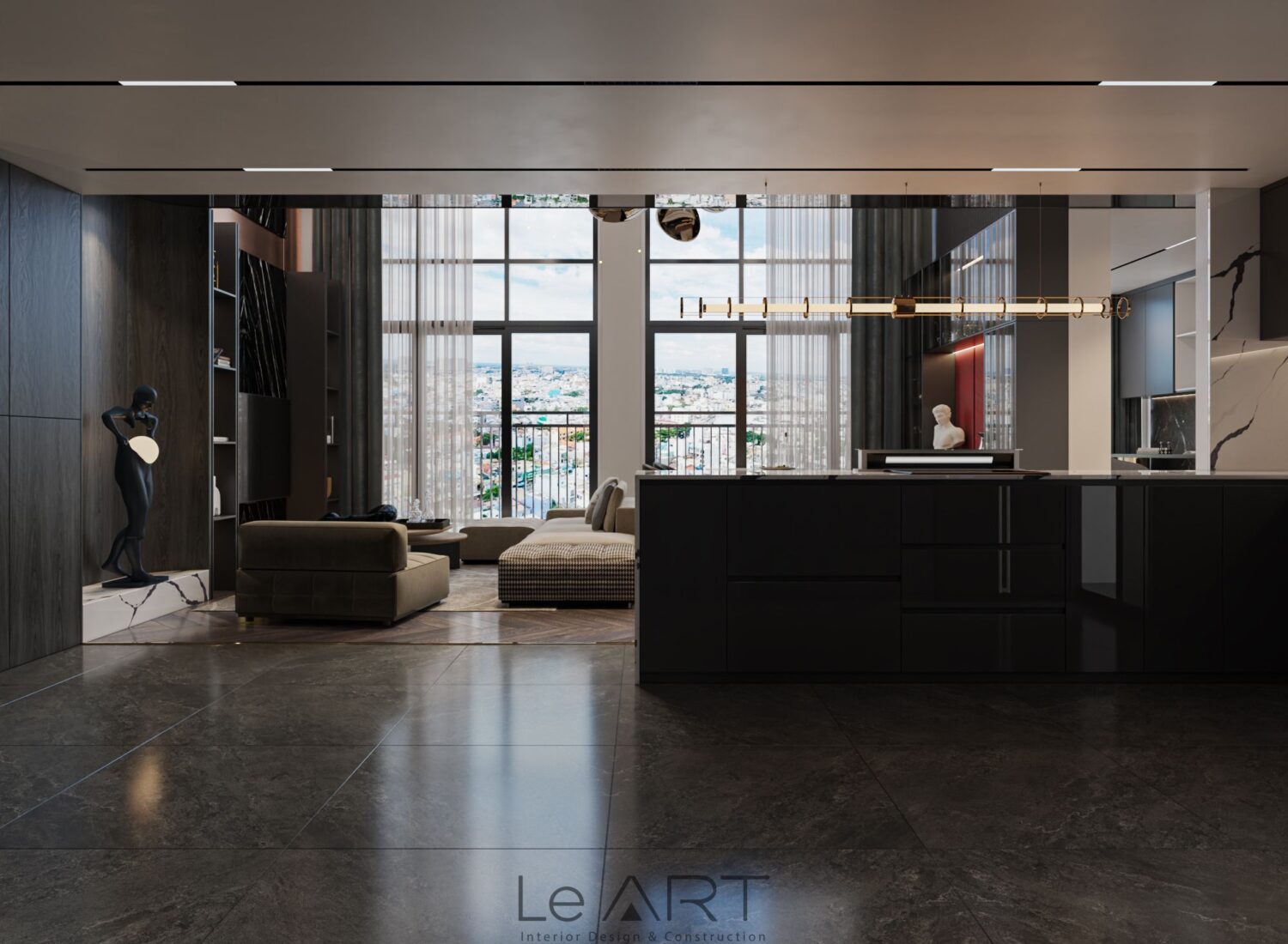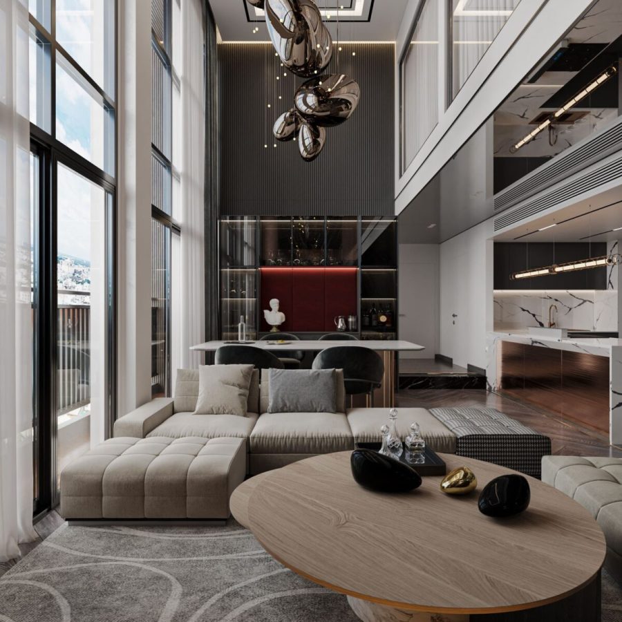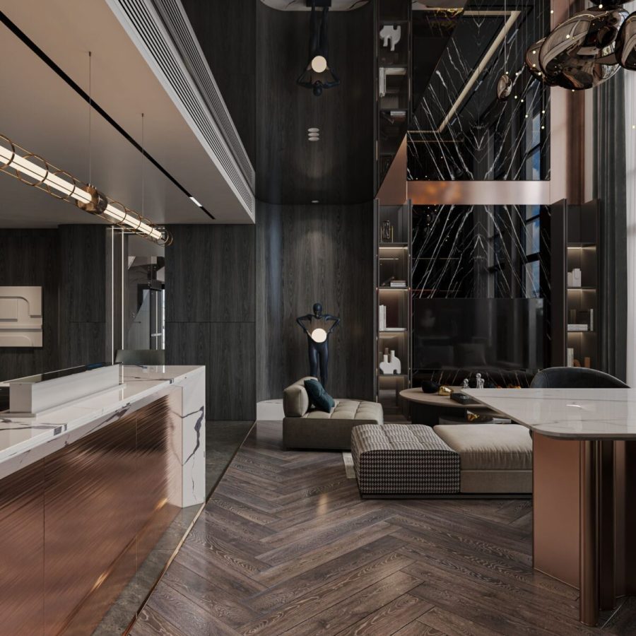 Luxury Modern Living Room with Marble Coffee Table and Black Sofa Set – 3D Model_IDC1117421308