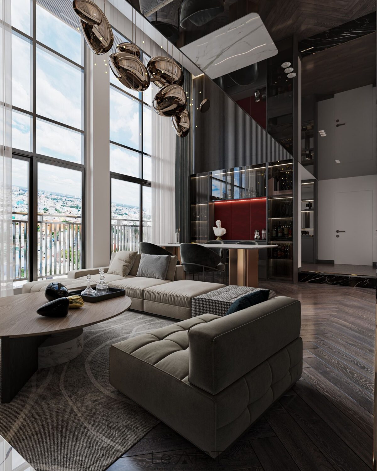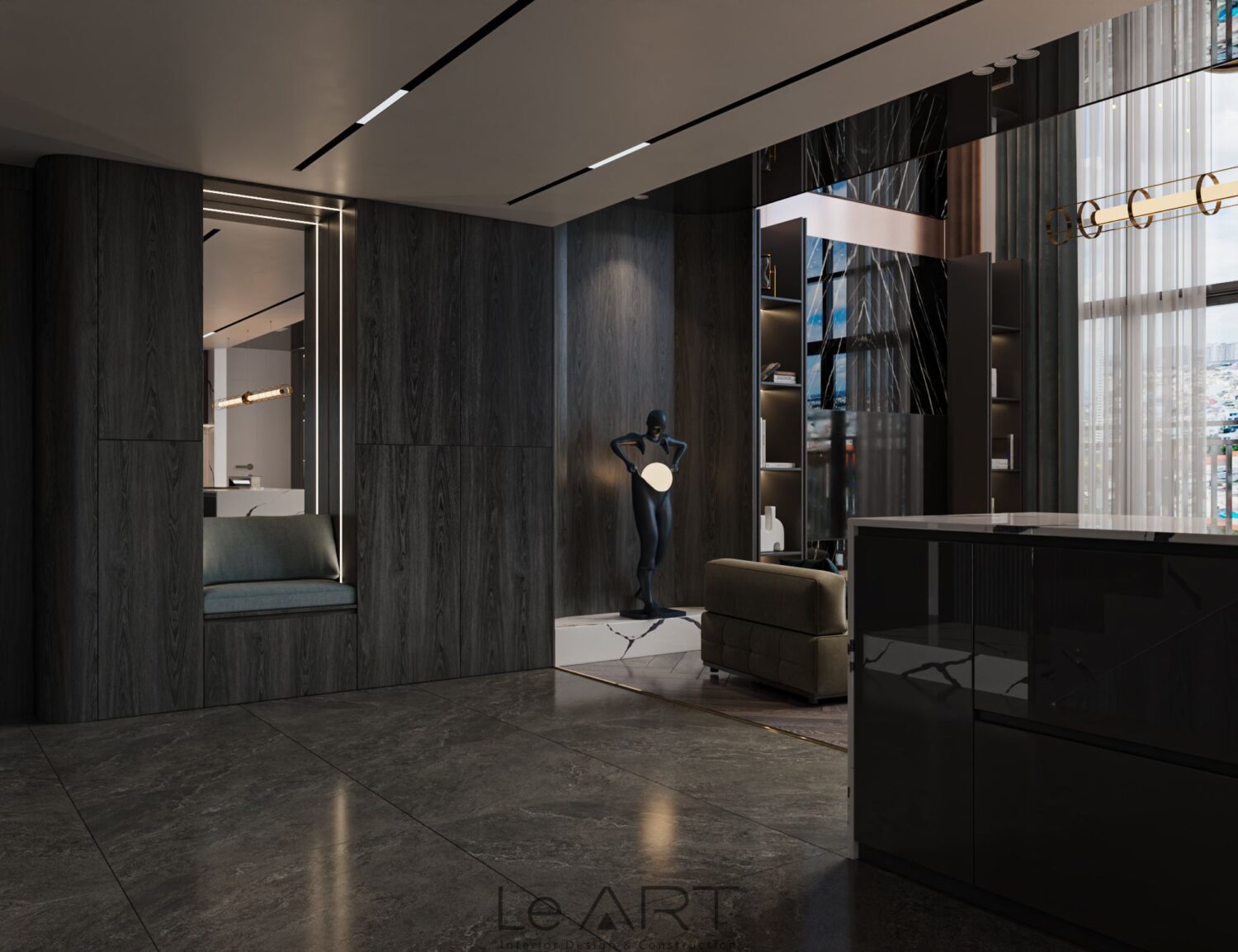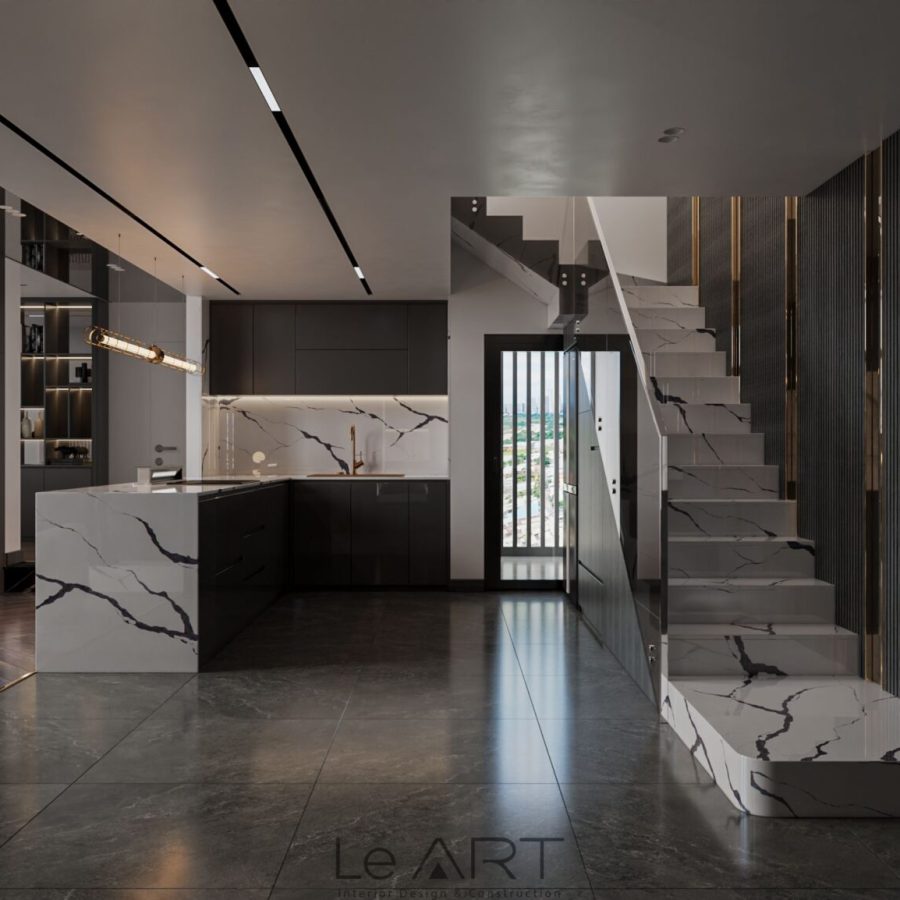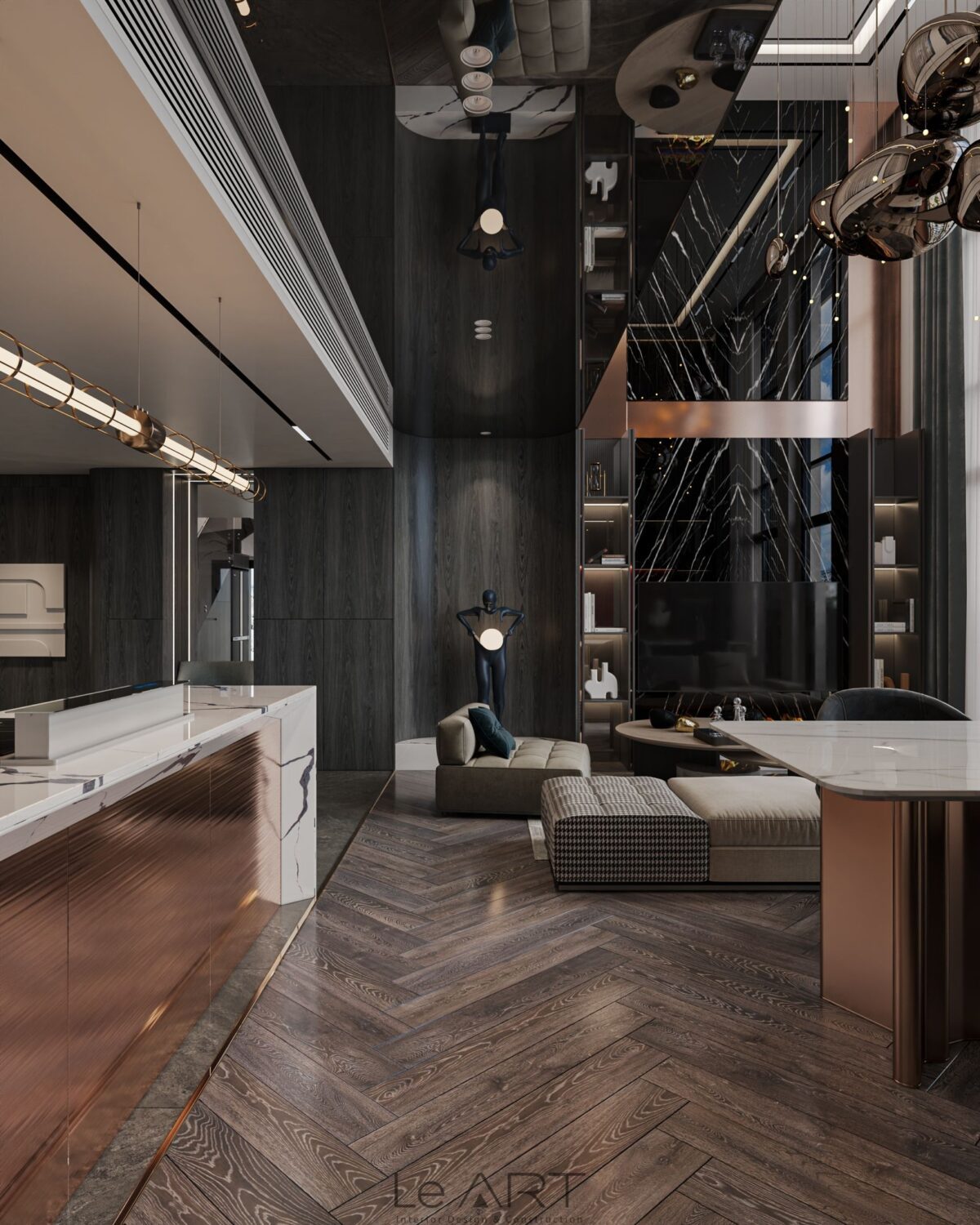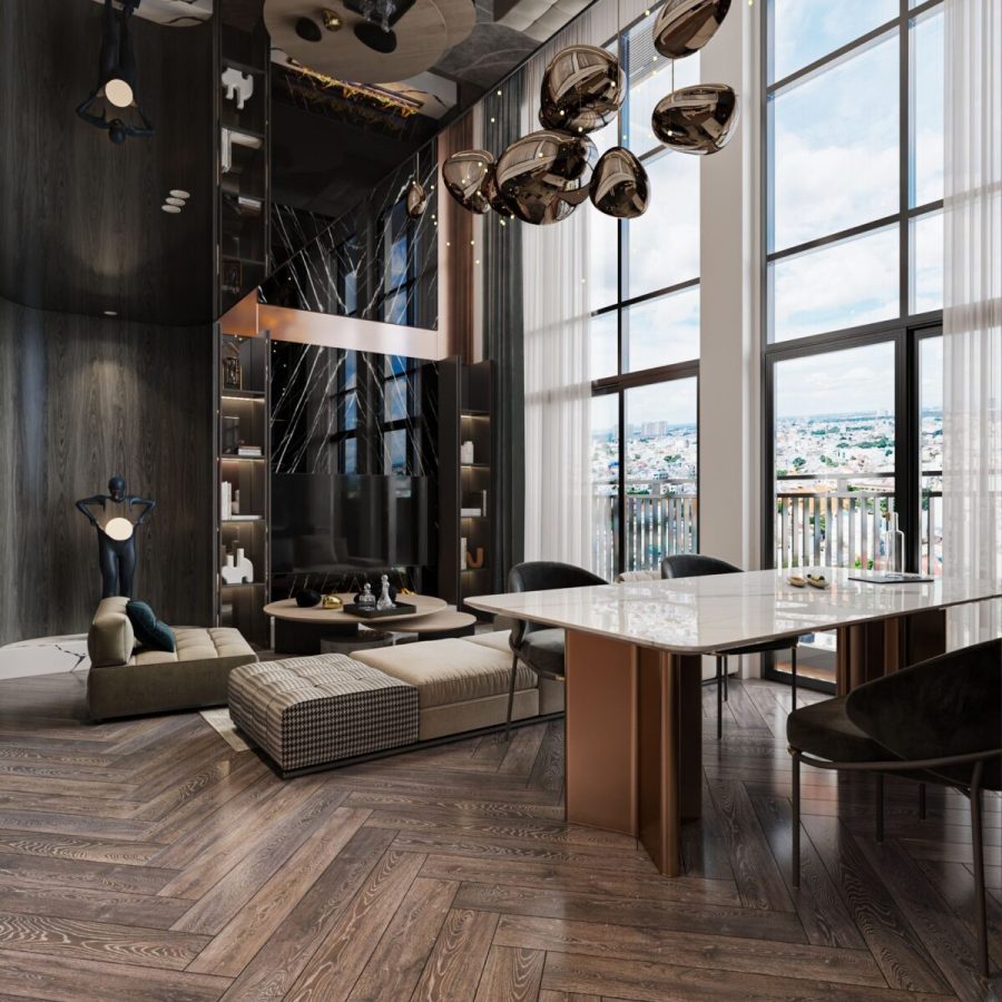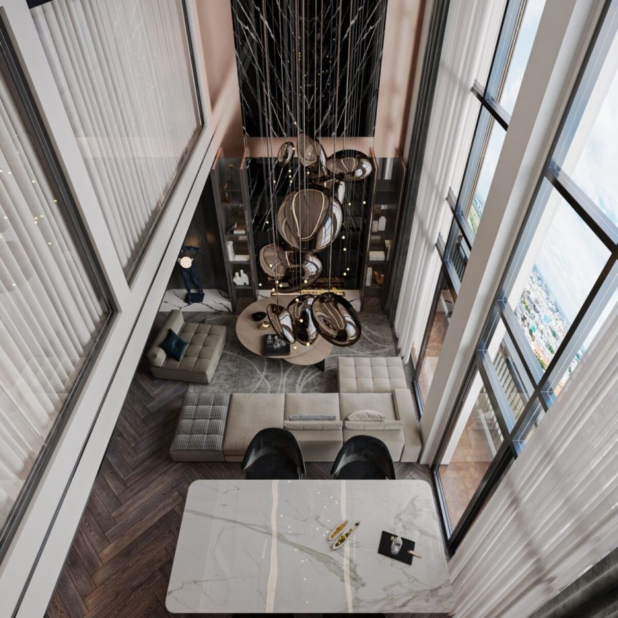 Luxury Modern Living Room with Marble Coffee Table and Black Sofa Set – 3D Model_IDC1117421308