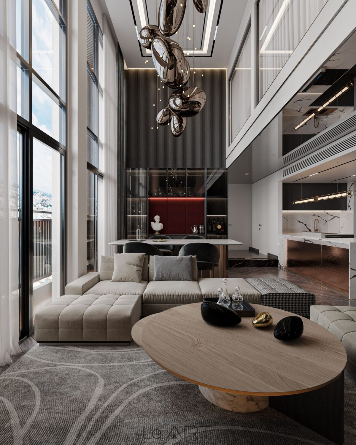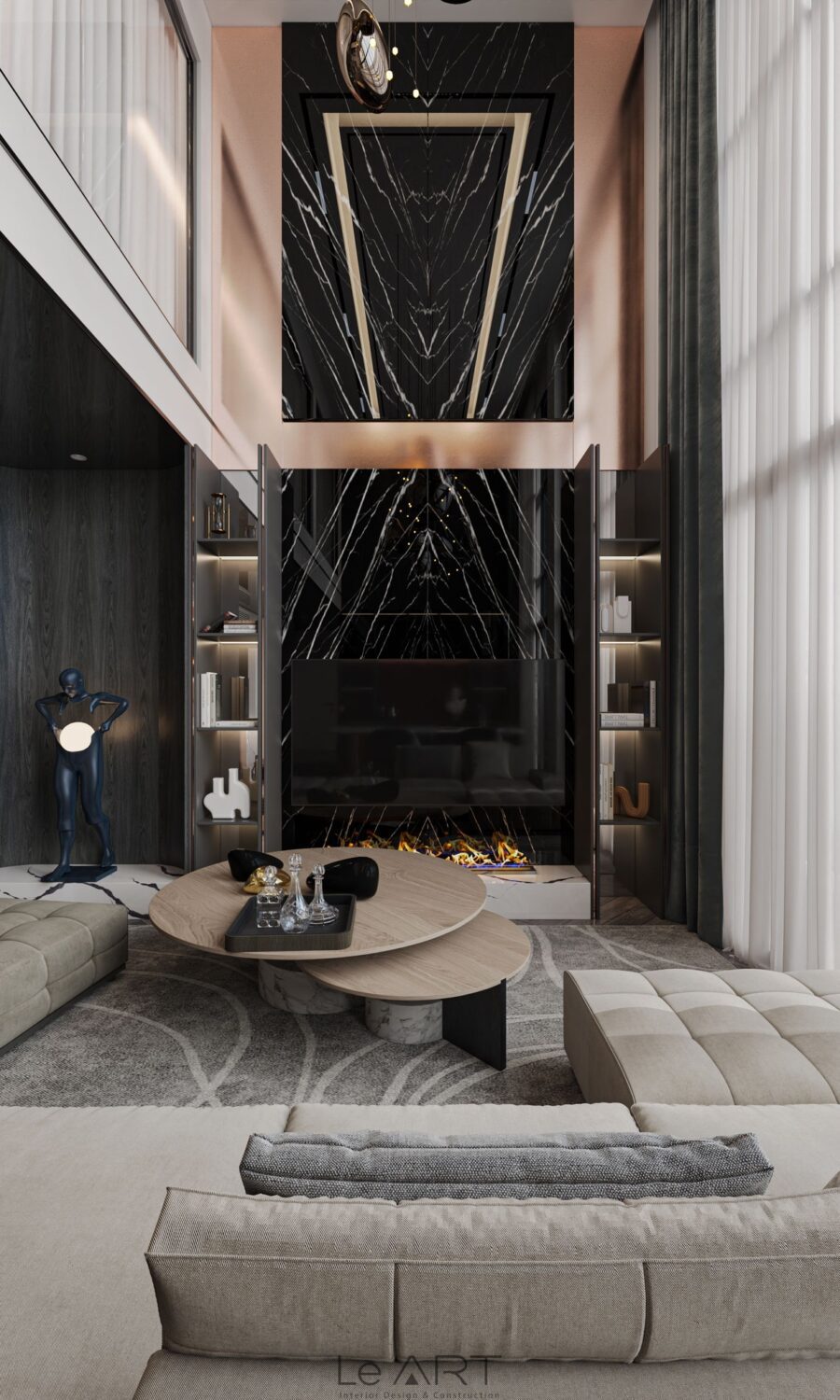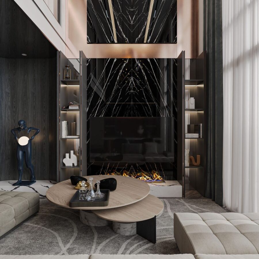 Luxury Modern Living Room with Marble Coffee Table and Black Sofa Set – 3D Model_114971306