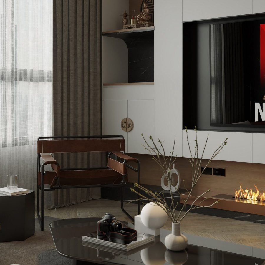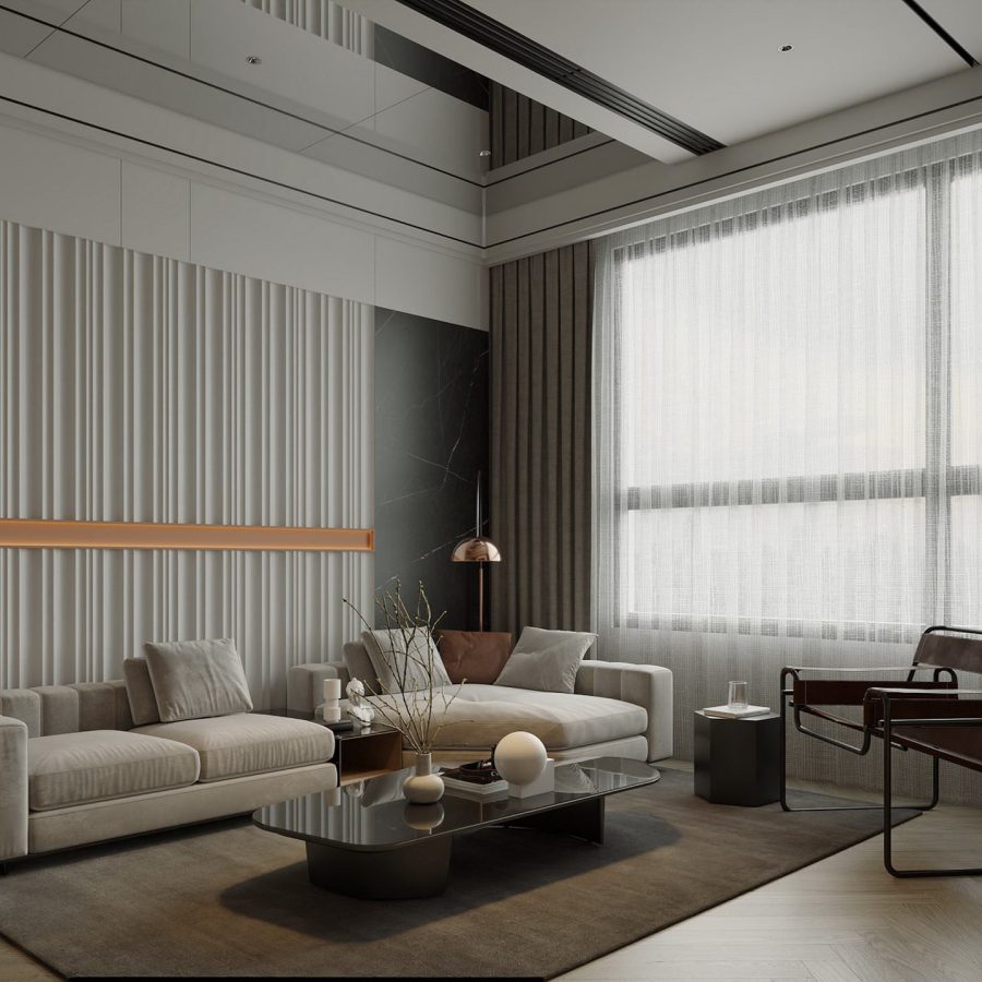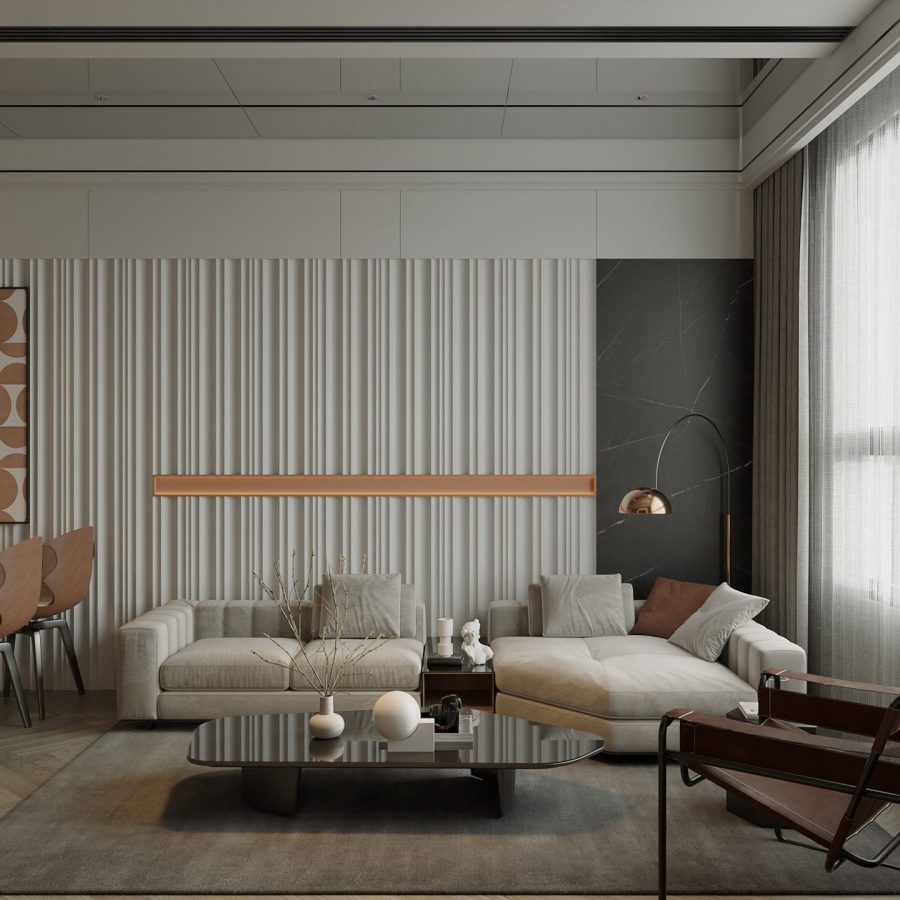 Luxury Modern Living Room with Marble Coffee Table and Black Sofa Set – 3D Model_IDC1117421308