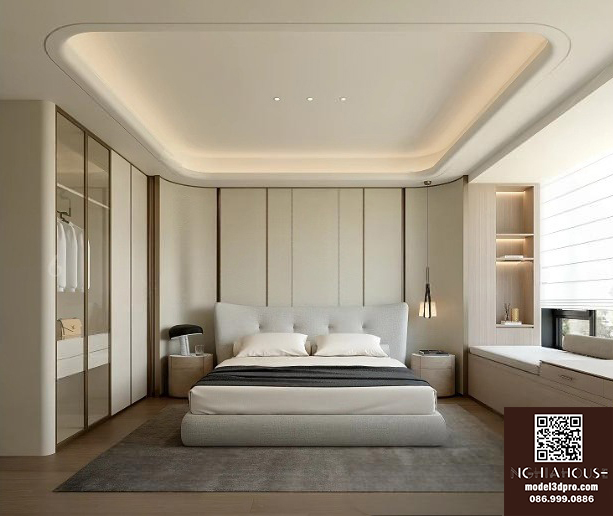 Minimalist White Living Room with Curved Sofa and Modern Desk – 3D Model_1156372390