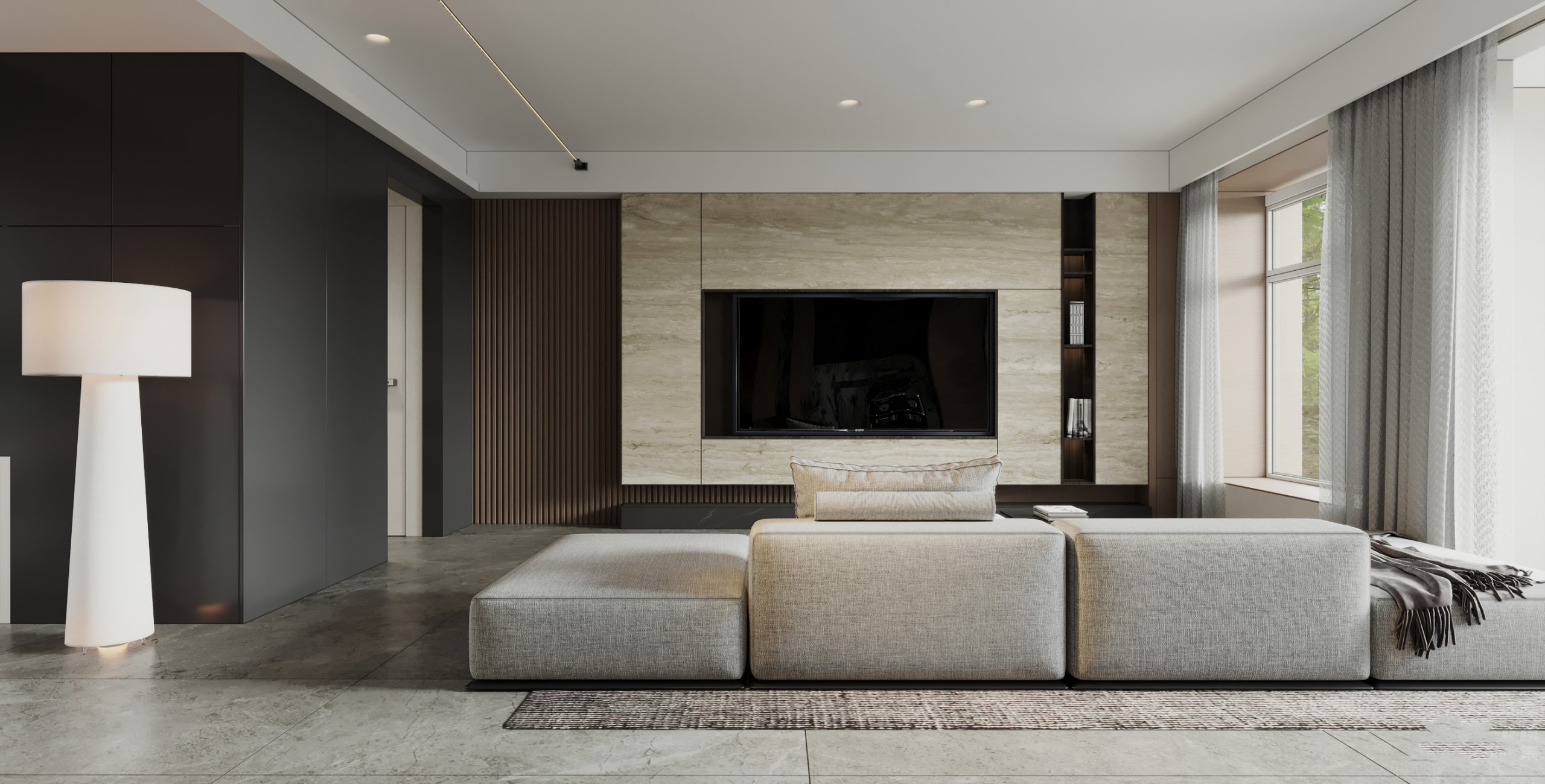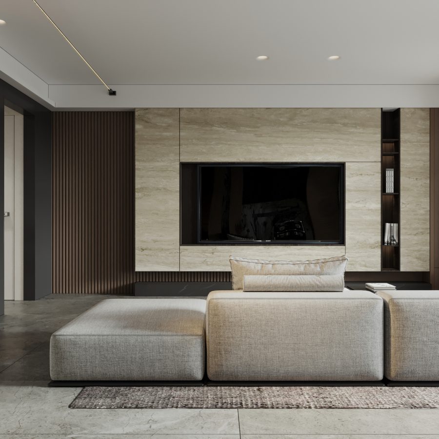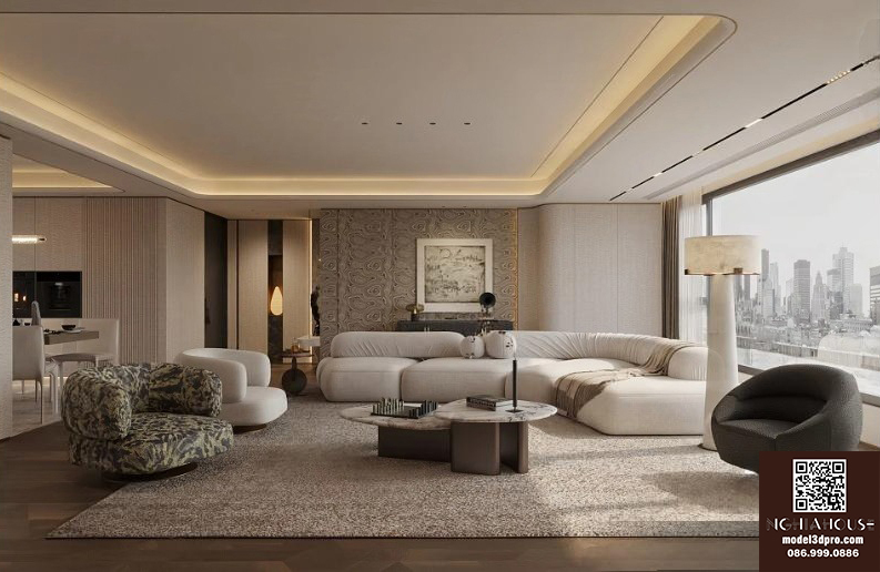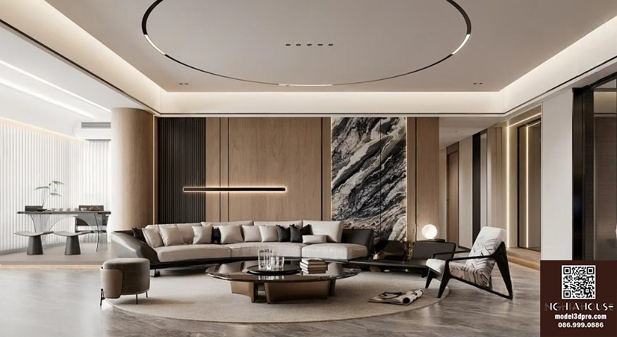 Luxury Modern Living Room with Marble Coffee Table and Black Sofa Set – 3D Model_114971306