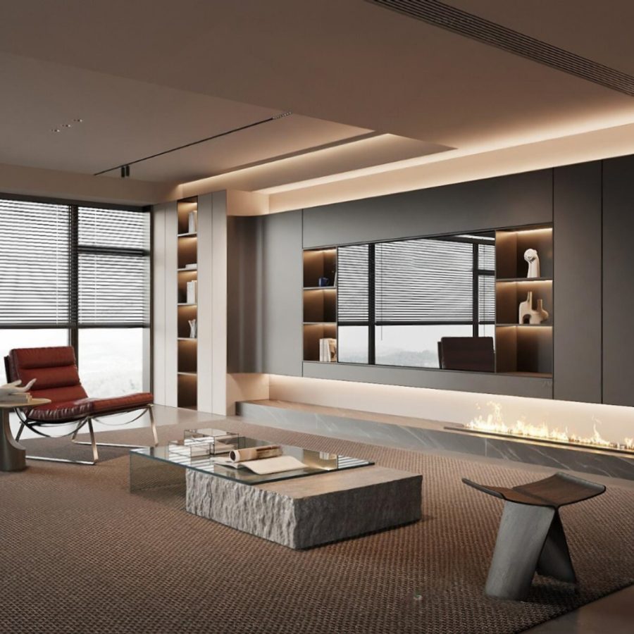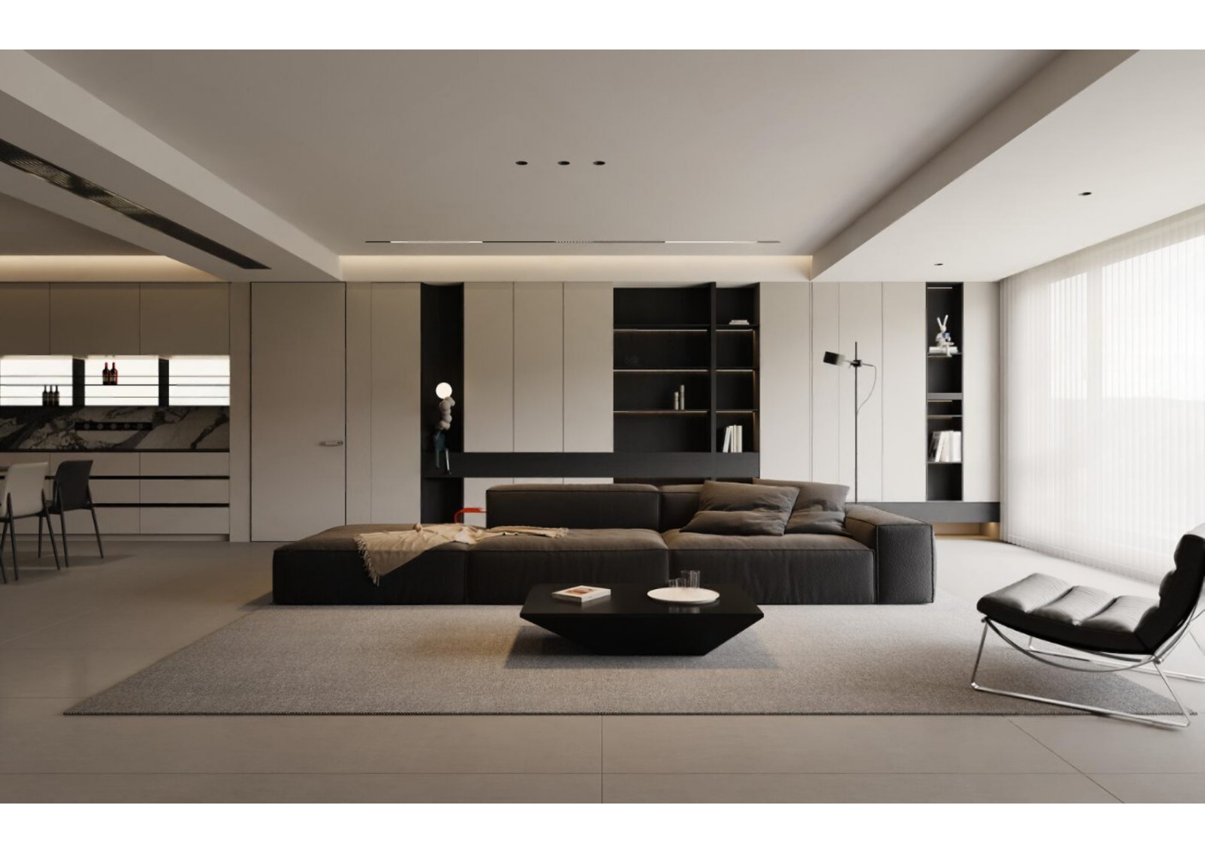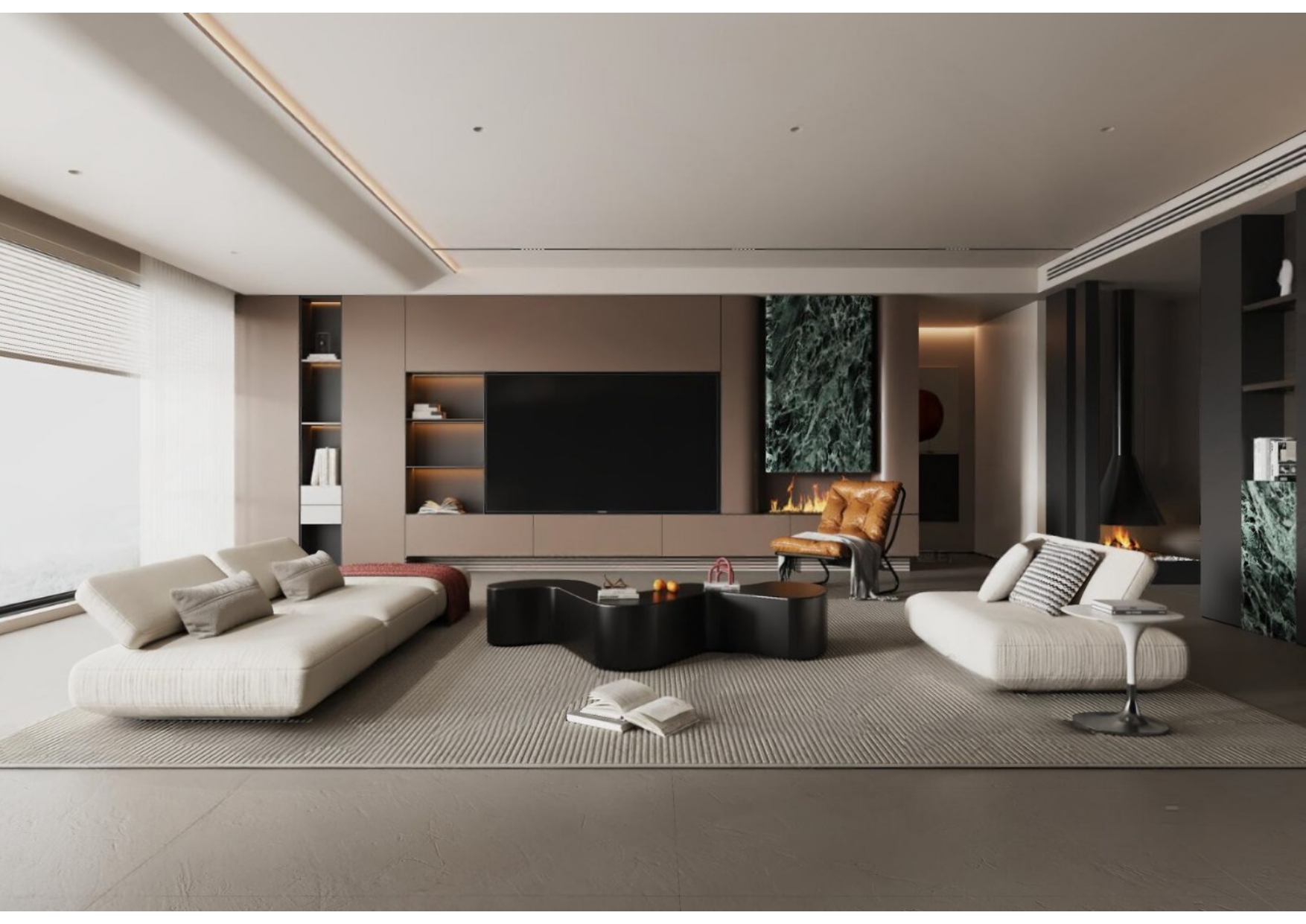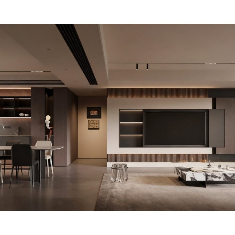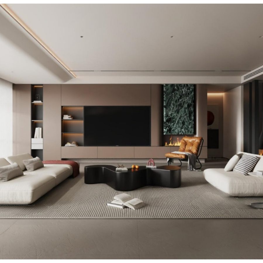 Luxury Modern Living Room with Marble Coffee Table and Black Sofa Set – 3D Model_114971306