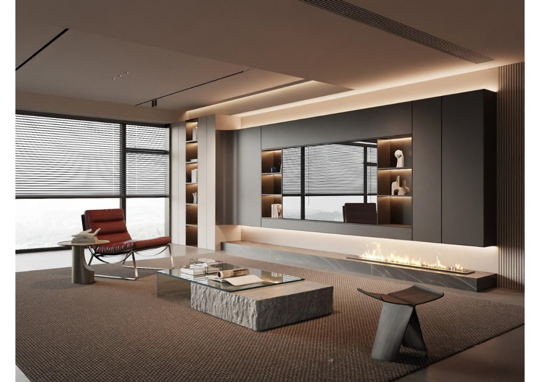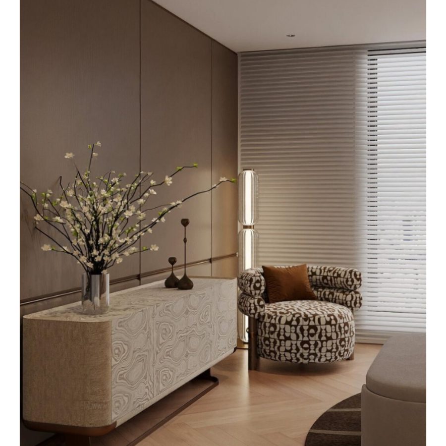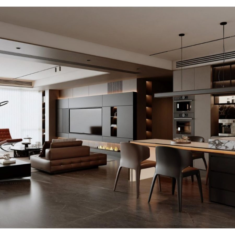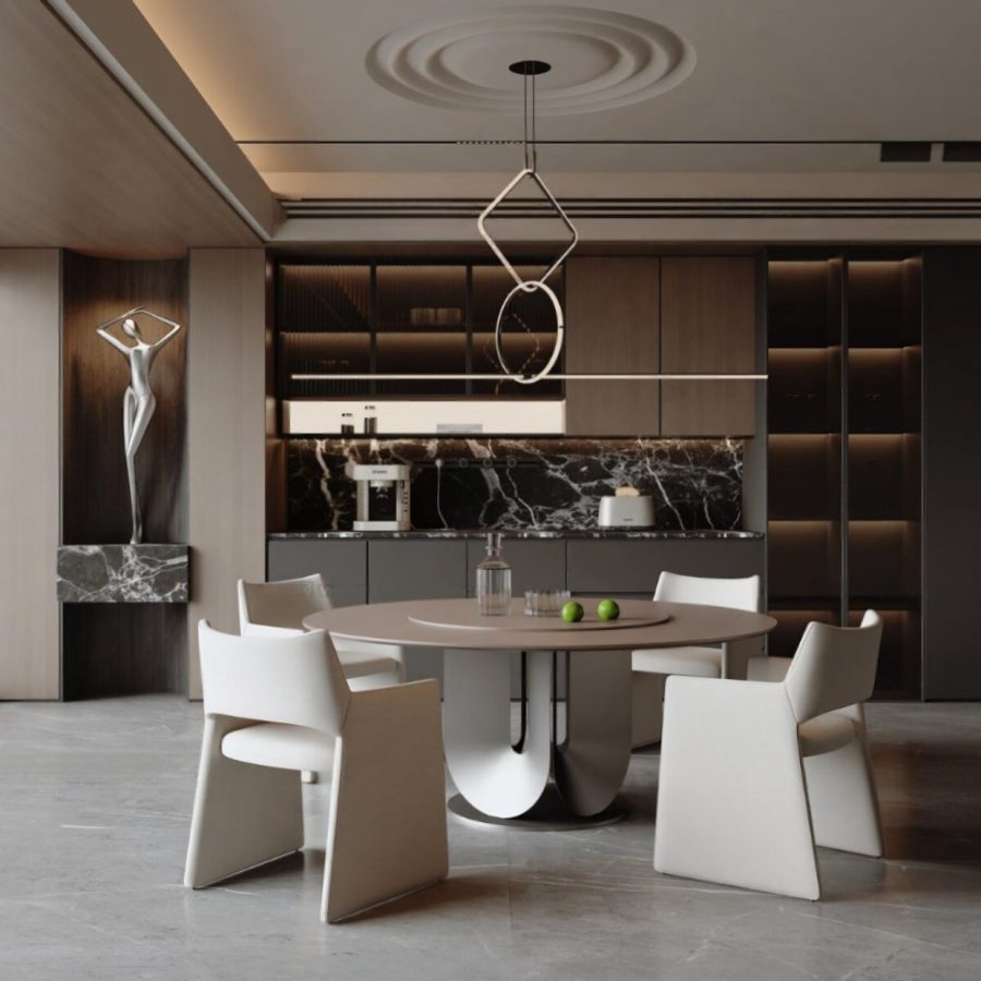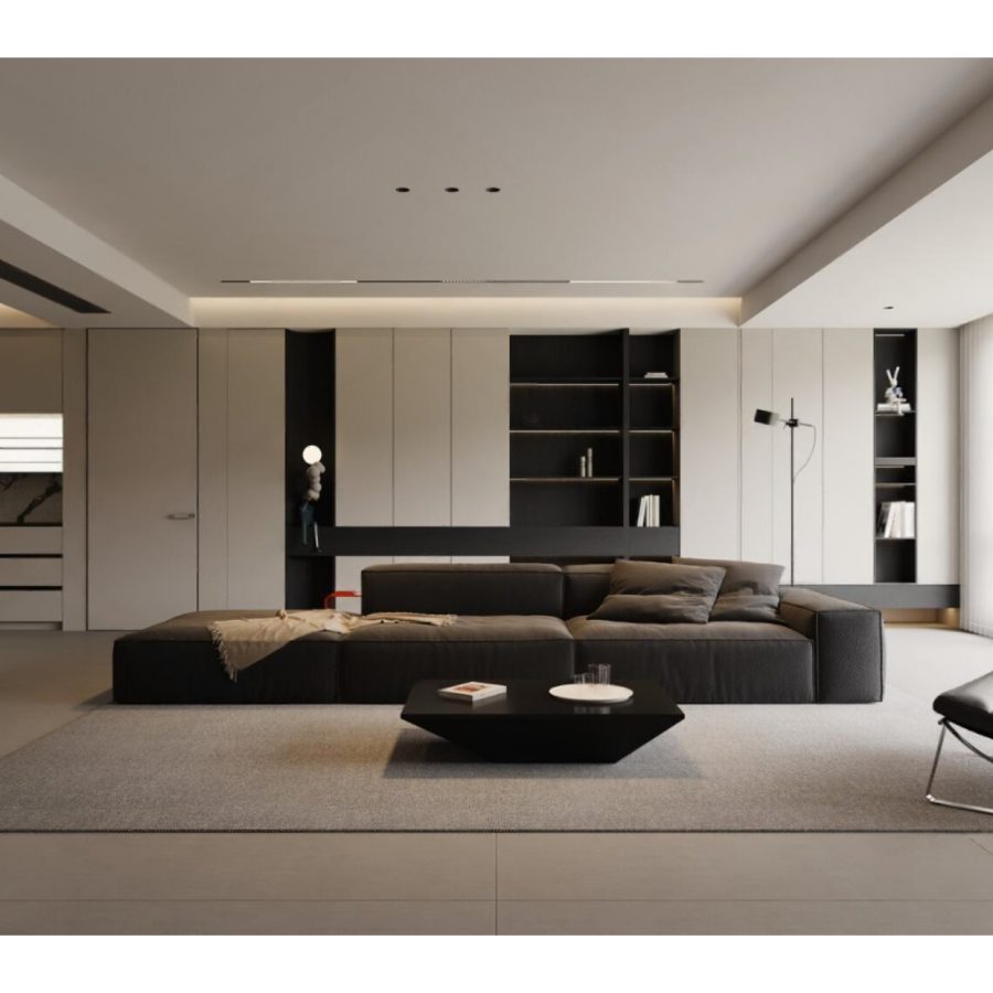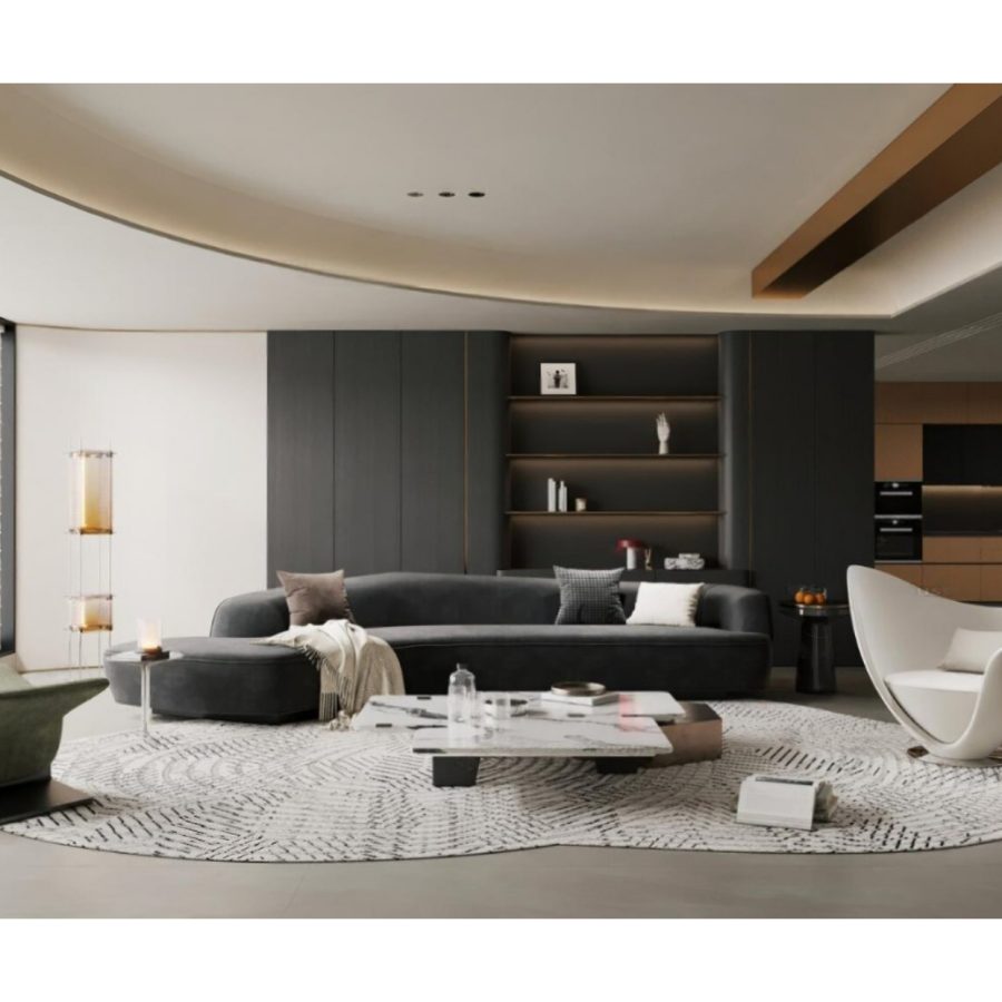 Luxury Modern Living Room with Marble Coffee Table and Black Sofa Set – 3D Model_IDC1117421308