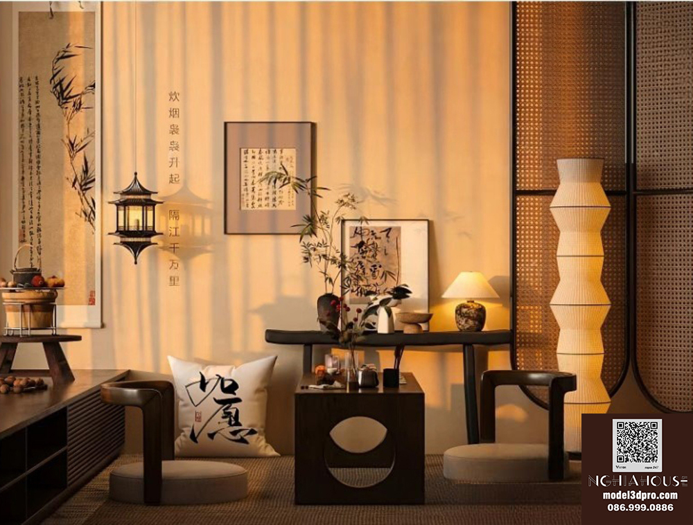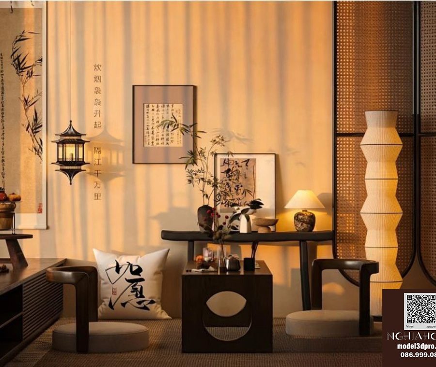 Free 3D Model Japanese Zen Garden Interior with Bonsai and Stone Statues_110845037