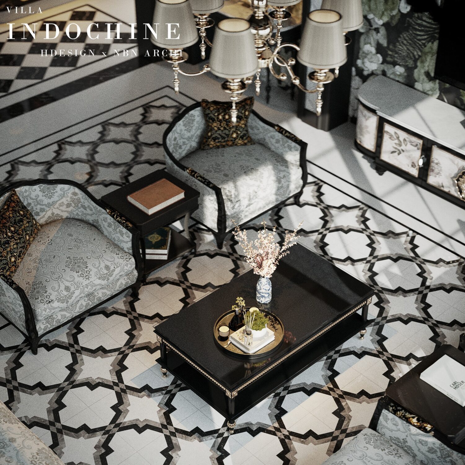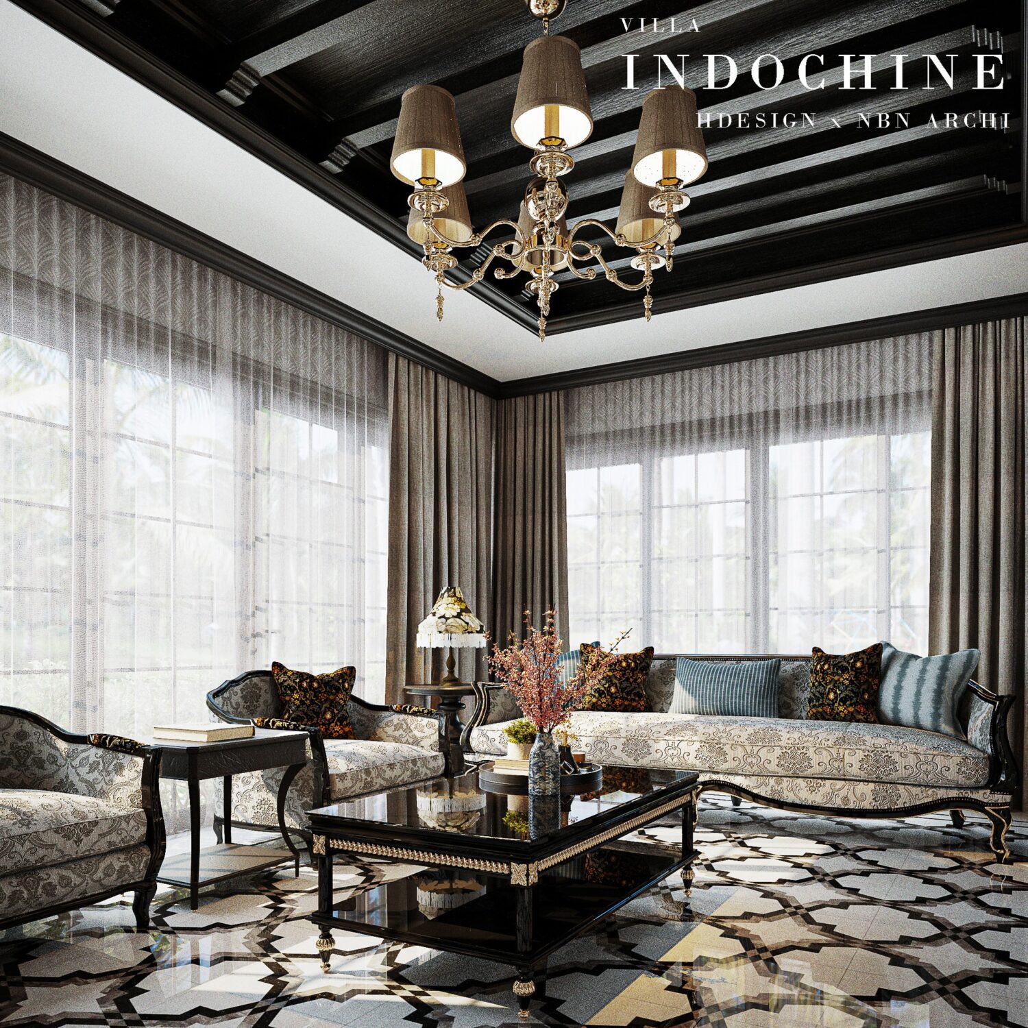 Luxury Modern Living Room with Marble Coffee Table and Black Sofa Set – 3D Model_IDC1117421308